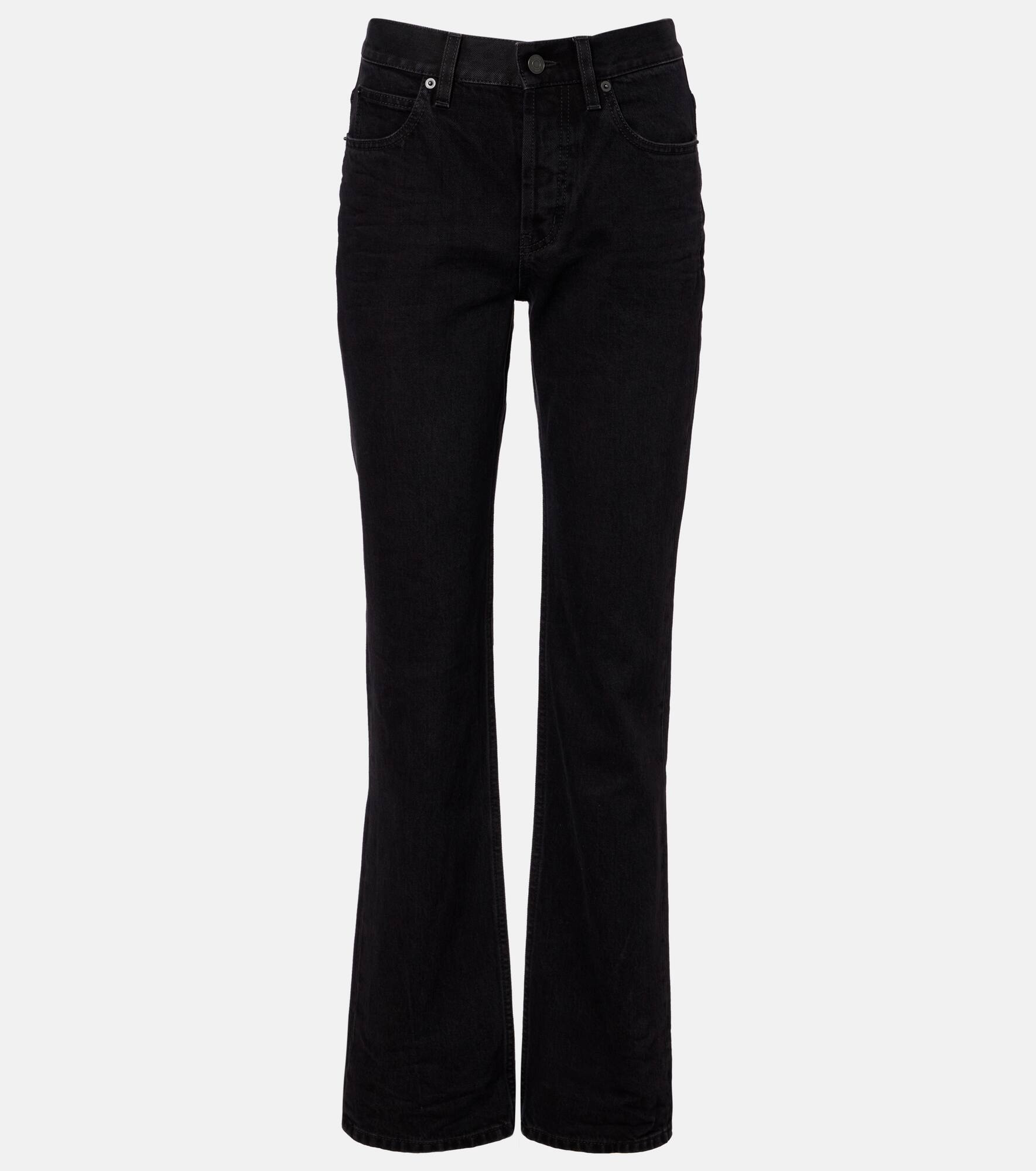 The Nico wide-leg jeans from Saint Laurent are a year-round staple for both casual and elevated looks. The design features a high-rise waistline and is finished with a leather logo patch at the back. Product Details - Material: 100% cotton - Care instructions: machine wash at 30 degrees - Made in Italy - Designer color name: Berlin Black - Item color: black - Details: 100% calf leather - Contains non-textile parts of animal origin - Closure: concealed button placket - Belt loops - Pockets: five pockets - Hardware color: black - Item number: P01086643 Size & Fit - Fits small to size - we recommend trying one size larger - Non-stretchy fabric - Wide-leg - High-rise - The model seen in the picture is 178cm-5'10" and wearing a size 27