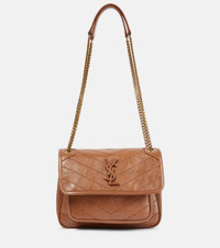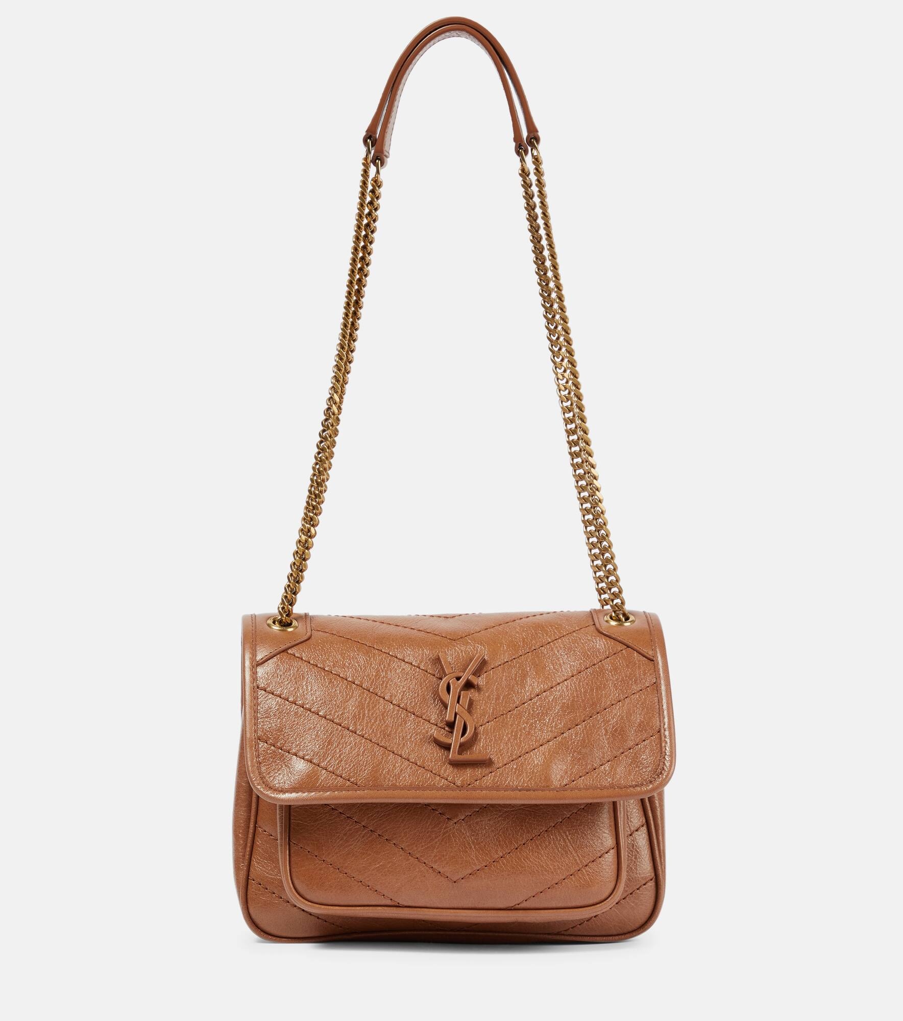 Saint Laurent's leather goods infuse looks with Parisian appeal. Hanging from double chain straps, the leather Niki Baby style has a foldover front with a tonal YSL monogram logo plaque. Product Details - Closure: magnetic-tab fastening - Internal details: internal slot pocket, fabric lining, two internal compartments - Designer color name: Light Caramel - Made in Italy - Comes with dust bag - Material: leather - Chain and leather shoulder strap - Item number: P00709648 Size & Fit - Height 16cm-6.5" - Width 22cm-8.5" - Max. depth 11cm-4.5" - Min. length shoulder strap 68cm-27" - Max. length shoulder strap 116cm-45.5"