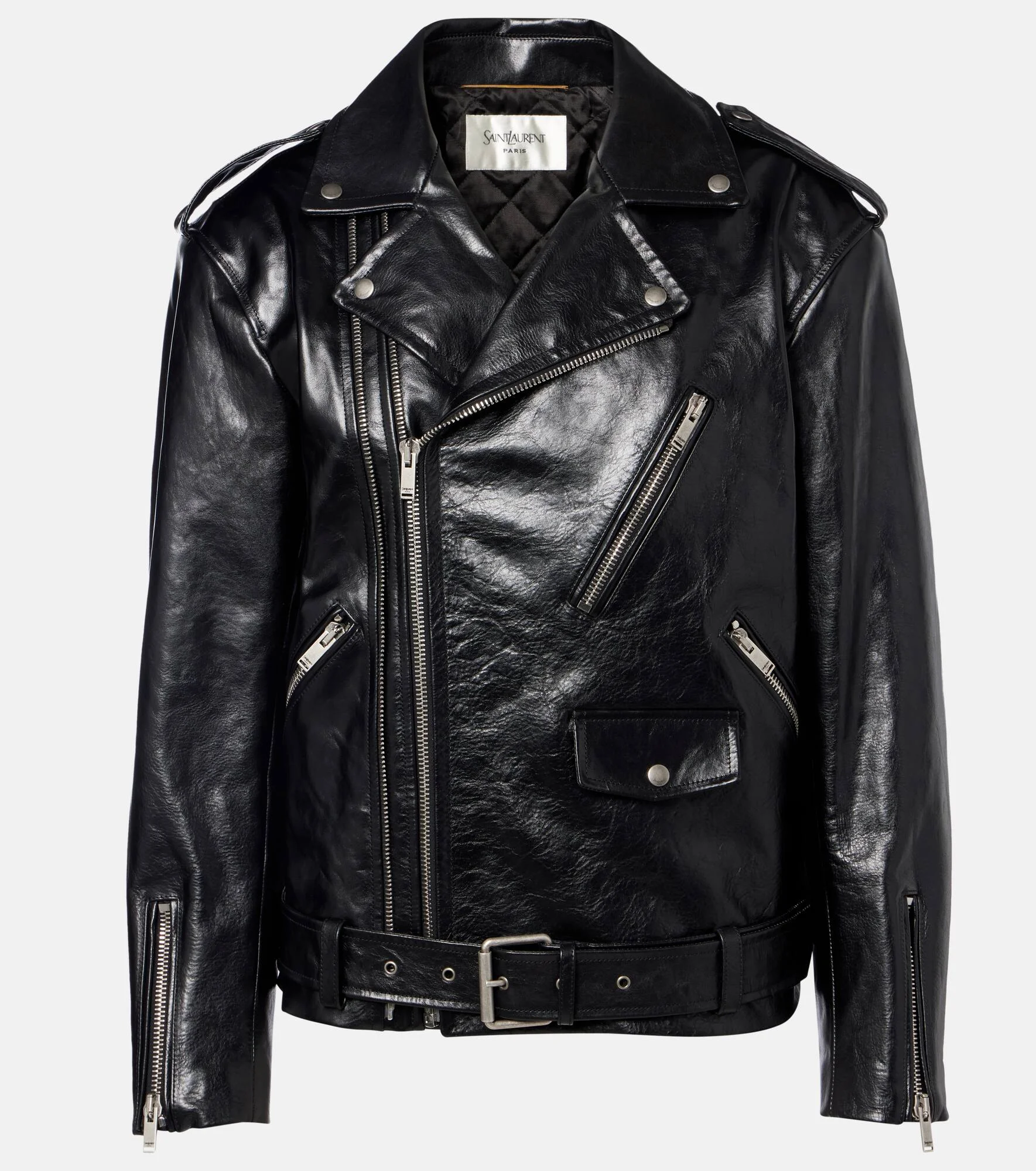 Since its conception in 1961, Saint Laurent has been coveted for its elegant Parisian aesthetic. A contemporary take on an age-old classic, this biker jacket is crafted from leather with warm padding, a belted waist, and myriad zip closures. Product Details - Material: 100% leather - Care instructions: do not wash - Made in Italy - Color: brown - Designer color name: Noir/Beige Rose - Lining: 62% viscose, 38% cotton - Pocket lining: 100% cotton - Filling: 100% polyester - Closure: zipper, snap-button fastenings - Attached belt - Pockets: zipped pockets - Item number: P01162492 Size & Fit - True to size - Oversized - Thick material - Stiff material - Non-stretchy fabric - Falls below the hip - Height of model is 178cm-70" and wears a size FR 34
