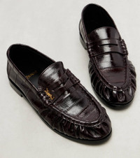 These polished loafers from Saint Laurent are destined to transcend trends and time. Detailed with the maison's Cassandre motif, they're made from patent leather with penny straps and gathered uppers. Product Details - Upper: eel leather - Lining: leather - Sole: leather insole and sole - Color: brown - Toe shape: round toe - Made in Italy - Includes: shoe box, dust bag - Designer color name: Burnt Brown - Hardware color: gold - Item number: P01143678 Size & Fit - True to size - Slightly narrow - European sizes - 2cm-1" heel