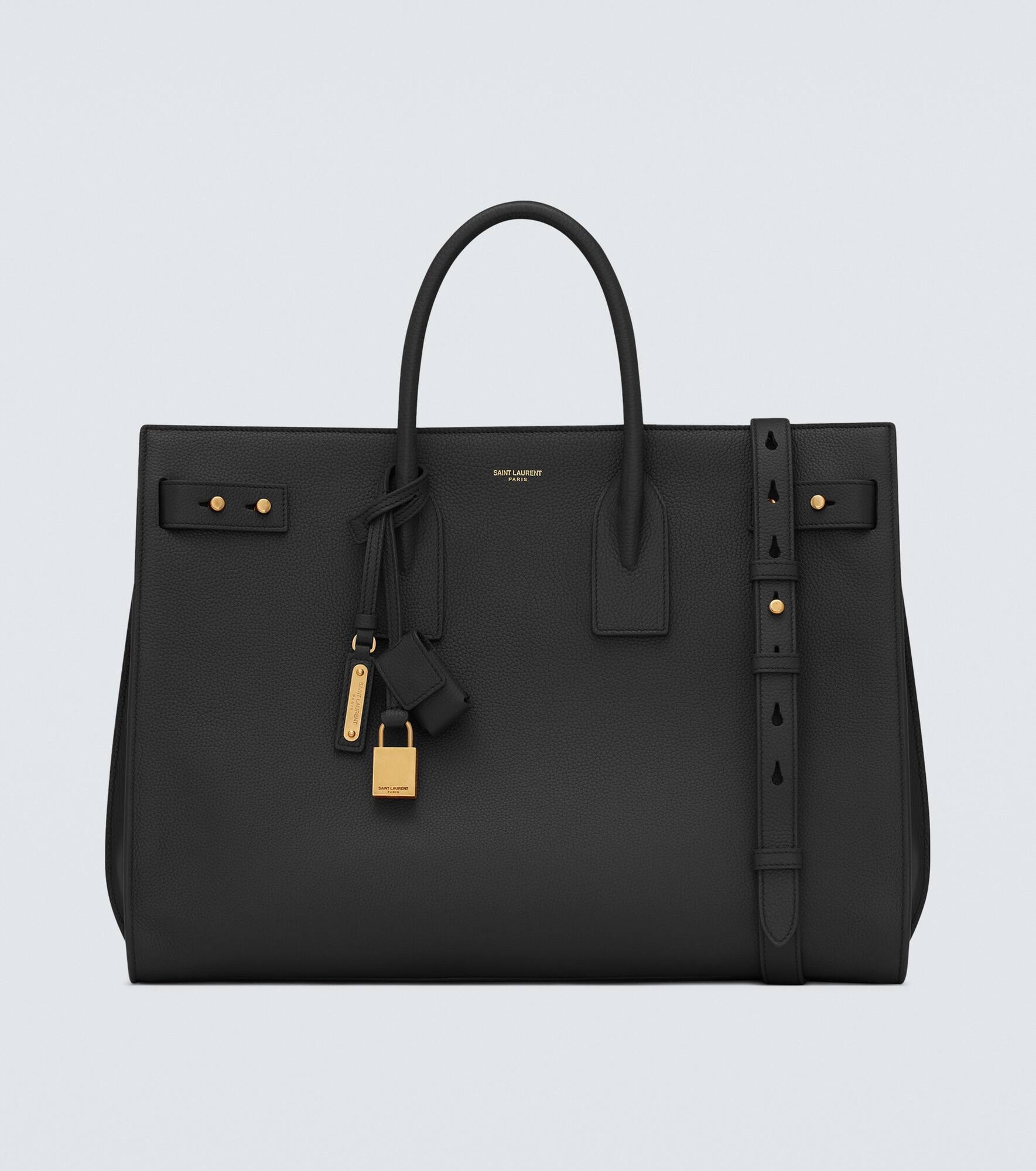 Saint Laurent's Sac de Jour Thin Large bag is the ultimate everyday bag. Made in Italy from grained leather, it has accordion sides and a central zipped pocket that divides two large compartments. Carry it by its rolled top handles or thin shoulder strap. Product Details - Material: leather - Comes with dust bag - Closure: open top - Lining: leather - Made in Italy - Designer color name: Noir - Top handles, Detachable, adjustable shoulder strap - Key fob - Internal details: internal slot pockets, zipped centre compartment, three internal compartments - Item number: P00645414 Size & Fit - Height 30cm-12" - Width 40cm-15.5" - Max. depth 14cm-5.5" - Length of handles 29cm-11.5" - Min. length shoulder strap 94cm-37" - Max. length shoulder strap 111cm-43.5"