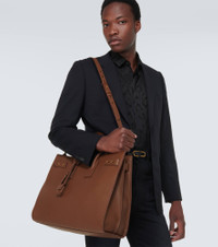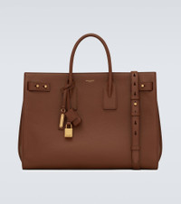 Saint Laurent’s signature Sac de Jour bag features accordion sides, a central zipped pocket, and two large compartments. Cut from grained brown leather, it has tubular handles, a padlock charm, and adjustable, detachable shoulder strap. Product Details - Trim: calf leather - Material: calf leather - Comes with dust bag - Designer color name: Light Bronze - Made in Italy - Internal details: suede lining, two internal compartments, zipped centre compartment - Closure: open top - Detachable, adjustable shoulder strap, Top handles - Item number: P00723099 Size & Fit - Height 30cm-12" - Width 40cm-15.5" - Max. depth 14cm-5.5" - Length of handles 29cm-11.5" - Min. length shoulder strap 94cm-37" - Max. length shoulder strap 111cm-43.5"