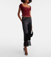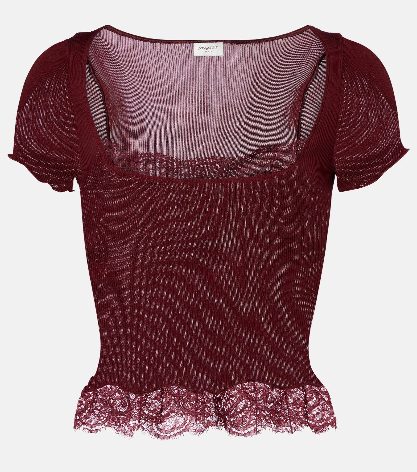 Since its conception in 1961, Saint Laurent has been coveted for its elegant Parisian aesthetic. This sumptuous top is crafted from fluid silk satin and defined by slender shoulder straps and a scalloped hem. Product Details - Material: 100% silk - Care instructions: dry clean - Made in Italy - Color: burgundy - Designer color name: Rouge Fonce - Details: 79% polyamide, 21% viscose - Trim: 94% silk, 6% elastane - Hem: scalloped - Item number: P01162519 Size & Fit - True to size - Fitted - Stretchy fabric - Falls to the hip - The model seen in the picture is 178cm-5'10" and wearing a size XS