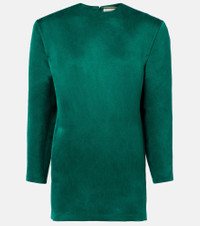 Since its conception in 1961, Saint Laurent has been coveted for its elegant Parisian aesthetic. This silk satin minidress is defined by its sculptural silhouette with oversized, structured shoulders. Product Details - Material: 100% silk - Care instructions: dry clean - Made in France - Designer color name: Vert - Item color: green - Lining: 100% silk - Hardware color: gold - Pockets: side slit pockets - Closure: concealed zipped back - Item number: P01086636 Size & Fit - True to size - Close fit at the hips - Loose bodice, fitted skirt - Non-stretchy fabric - The model seen in the picture is 178cm-5'10" and wearing a size FR 36