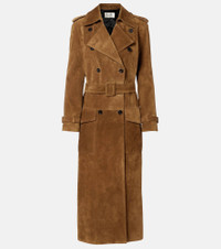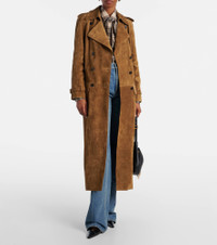 Since its conception in 1961, Saint Laurent has been coveted for its elegant Parisian aesthetic. This suede trench coat features a buttoned, double-breasted design and is finished with a detachable belt for an adjustable fit at the waist. Product Details - Material: 100% calf leather (suede) - Care instructions: specialist clean - Made in Italy - Designer color name: Noix - Item color: brown - Lining: 60% cupro, 40% cotton - Pocket lining: 100% cotton - Contains non-textile parts of animal origin - Closure: double-breasted (six buttons) - Notched lapel - Belt loops - Detachable belt - Pockets: flap pockets - Epaulettes - Cuff: strap, buckle and loops - Includes: garment bag - Item number: P01078575 Size & Fit - True to size - Loose fit, comes with belt - Non-stretchy fabric - slit length 51,0cm-20" - The model seen in the picture is 178cm-5'10" and wearing a size FR 34
