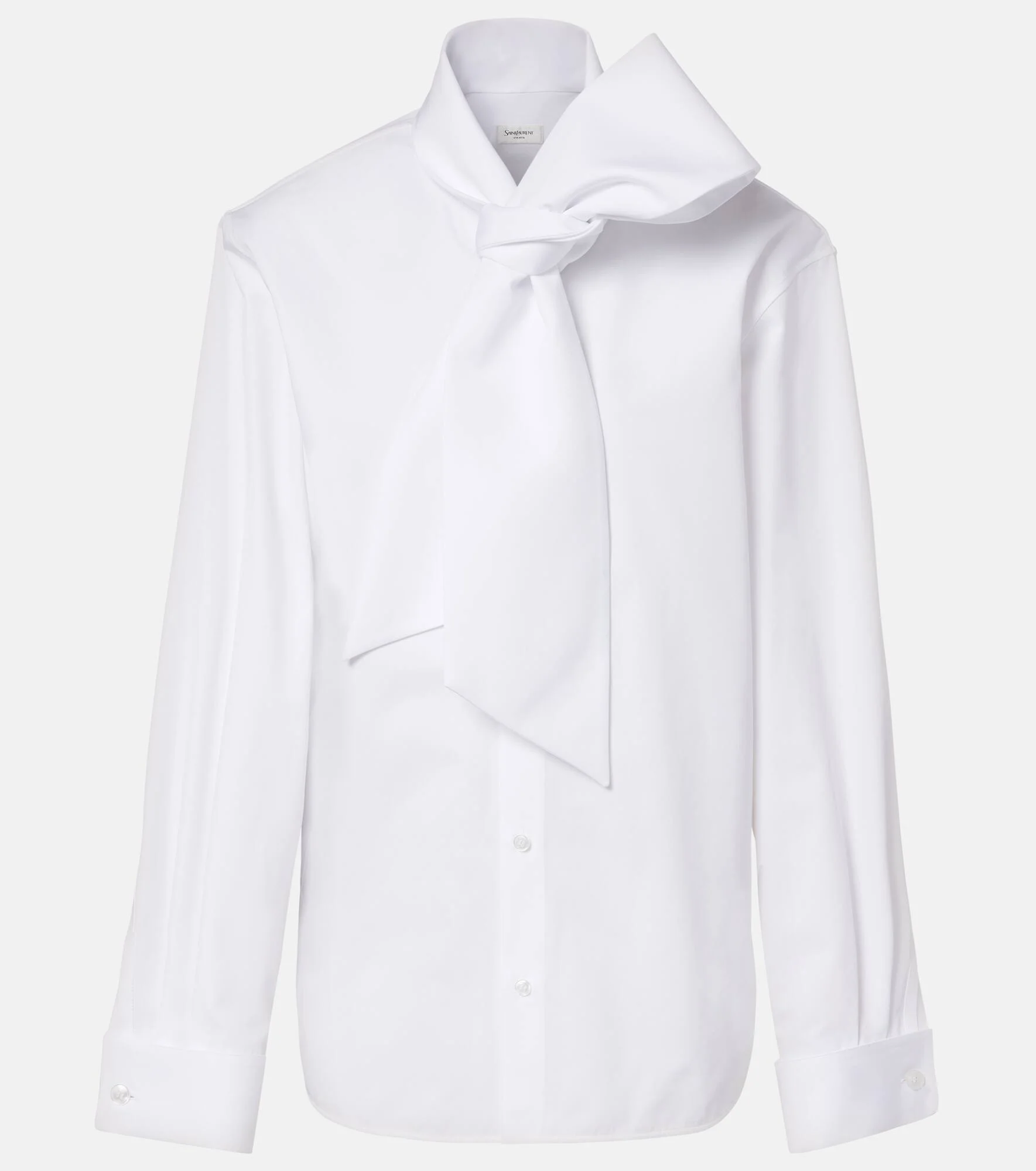 Since its conception in 1961, Saint Laurent has been coveted for its elegant Parisian aesthetic. This cotton poplin blouse creates a polished look with its elegant self-tie collar and pleated long sleeves. Product Details - Material: 100% cotton - Care instructions: dry clean - Made in Italy - Color: white - Designer color name: Blanc - Self-tie collar - Closure: buttoned front - Cuff: one button - Item number: P01162534 Size & Fit - True to size - Dropped shoulders - Designed for a loose fit - Stiff material - Non-stretchy fabric - Falls below the hip - Height of model is 175cm-69" and wears a size FR 34