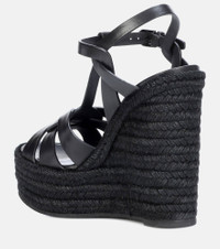 Saint Laurent's Tribute espadrilles are complete with a 130mm jute wedge and smooth leather upper. This warm-weather style has been crafted in Spain in a timeless black colorway for effortless sunshine chic. Product Details - Toe shape: round open toe - Lining: leather - Sole: leather insole, rubber sole - Upper: leather - Made in Spain - Designer color name: Nero - Closure: buckle-fastening ankle strap - Item number: P00291560 Size & Fit - True to size - European sizes - 4,5cm-2" platform (size EU 38) - 13cm-5" wedge heel (size EU 38)
