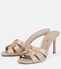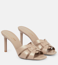 These beige sandals are a pared-back take on Saint Laurent's iconic Tribute platforms. Designed in the style of backless mules, they have slender 85mm heels and interwoven straps across squared toes. Product Details - Lining: leather - Upper: calf leather - Sole: leather insole and sole - Toe shape: square open toe - Comes with a box - Designer color name: Dark Beige - Made in Italy - Comes with dust bag - Item number: P00645201 Size & Fit - True to size - Narrow at the toe - European sizes - 8,5cm-3.5" heel (size EU 38)