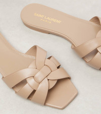 Mixing glamour and ease, Saint Laurent's Tribute Nu Pieds 05 slides are a masterclass in elegant nonchalance. Made from grained beige leather, they have interwoven straps that form the pair's namesake motif. Product Details - Lining: leather - Upper: calf leather - Sole: leather insole and sole - Toe shape: square open toe - Comes with dust bags, Comes with a box - Designer color name: Dark Beige - Made in Italy - Item number: P00645202 Size & Fit - Fits slightly large to size - we recommend trying a half size smaller - European sizes - 1,5cm-0.5" heel (size EU 38)
