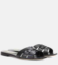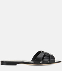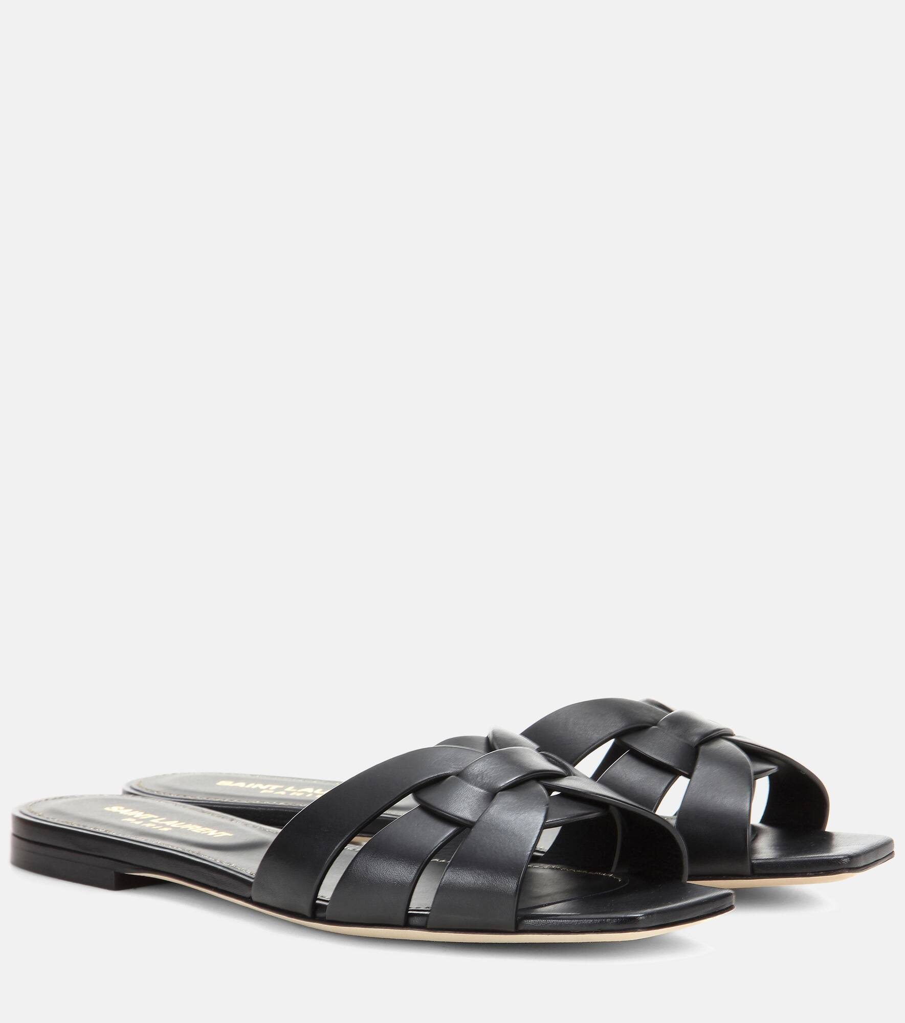 Saint Laurent's Nu Pieds 05 are a go-to summer flat option. Crafted in Italy from smooth black leather, this style has intertwining Tribute straps that create an effortlessly chic design. Team yours with cropped boyfriend jeans or printed dresses. Product Details - Lining: leather - Sole: leather insole and sole - Upper: calf leather - Toe shape: square open toe - Made in Italy - Designer color name: Nero - Item number: P00291488 Size & Fit - True to size - European sizes - 1,5cm-0.5" heel (size EU 38)