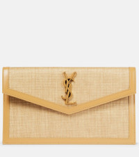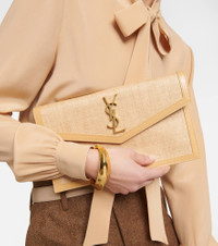 Whether you're heading uptown or downtown, this Saint Laurent clutch will lend a touch of Parisian glamour to your looks. Made from leather-trimmed micro raffia, it has a slim, envelope silhouette with a signature monogram plaque. - material: fabric - trim: leather - internal details: fabric lining - magnetic fastening - Made in Italy - comes with dust bag - Designer colour name: Naturel Beige size & fit - Height 16cm-6.5" - Width 27,5cm-11" - Depth 1,5cm-0.5"