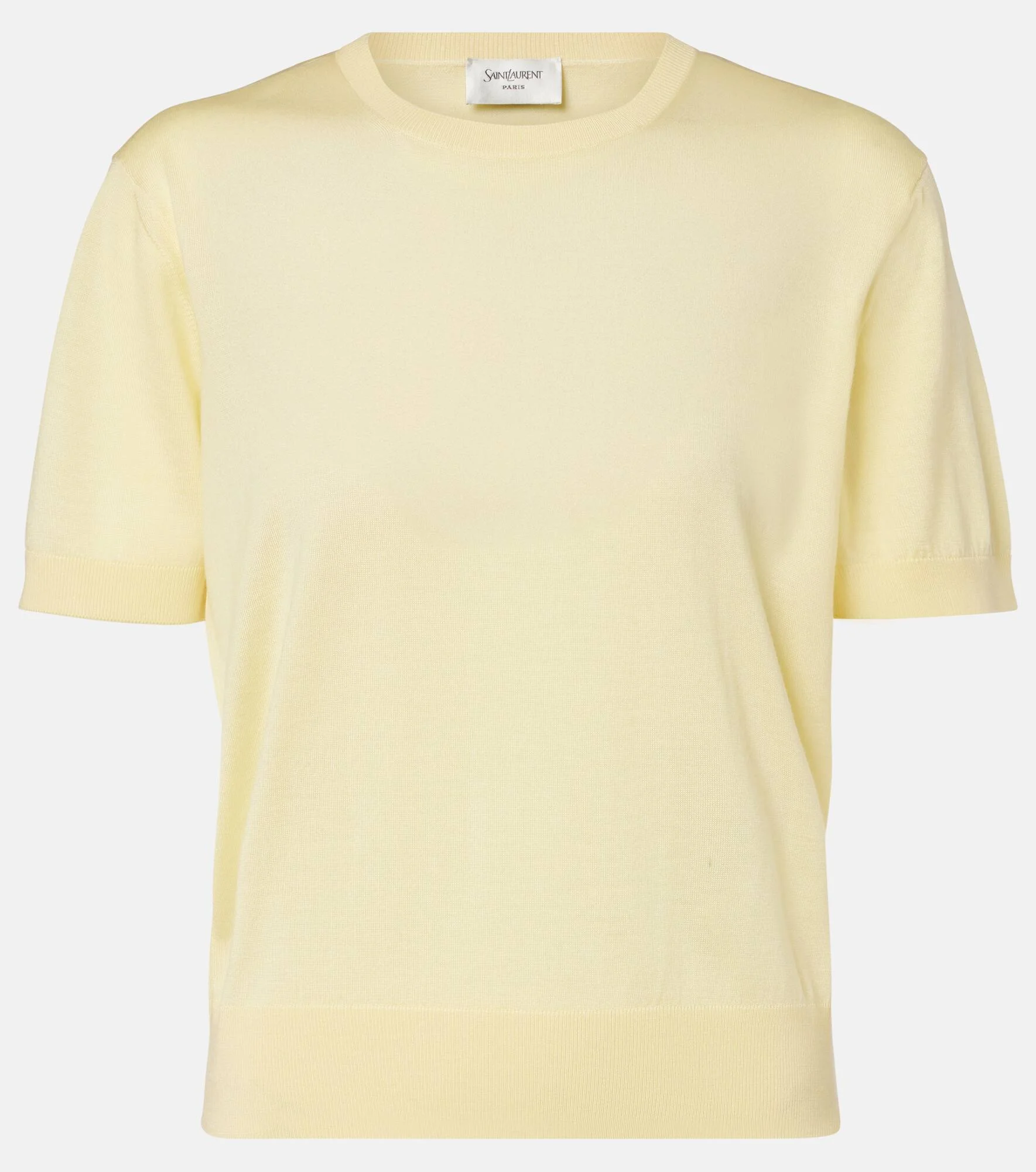 Since its conception in 1961, Saint Laurent has been coveted for its elegant Parisian aesthetic. This sweater is Italian-crafted from wool, cashmere, and silk into a T-shirt-style silhouette with short sleeves and a crew neckline. Product Details - Material: 35% wool, 35% cashmere, 30% silk - Care instructions: dry clean - Made in Italy - Color: yellow - Designer color name: Jaune Pale - Item color: yellow - Collar: crewneck - Cuff: ribbed - Hem: ribbed - Item number: P01128215 Size & Fit - True to size - Cinched waist - Elasticated hem - Slightly cropped - The model seen in the picture is 178cm-5'10" and wearing a size XS
