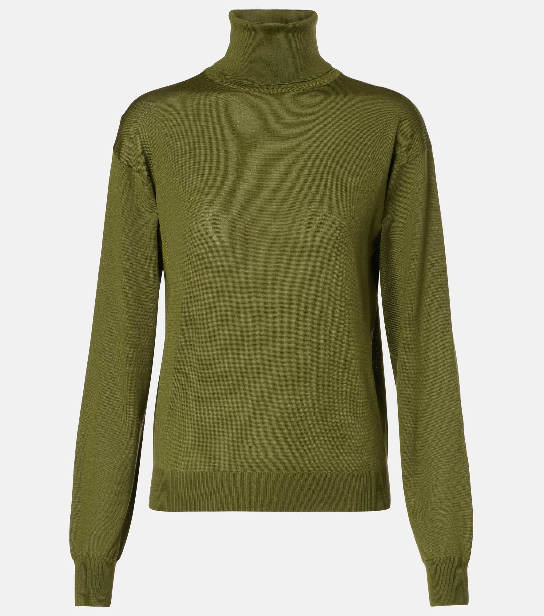 Since its conception in 1961, Saint Laurent has been coveted for its elegant Parisian aesthetic. This turtleneck sweater is crafted from ultra-soft wool, cashmere, and silk and is cut to a relaxed fit. Product Details - Material: 35% wool, 35% cashmere, 30% silk - Care instructions: dry clean - Made in Italy - Designer color name: Vert Olive - Item color: green - Material II: 32% wool, 32% cashmere, 28% silk, 6% polyamide, 2% elastane - Collar: turtleneck - Hem: ribbed - Cuff: ribbed - Item number: P01078557 Size & Fit - True to size - Dropped shoulders - Designed for a loose fit - Stretchy fabric - Falls to the hip - The model seen in the picture is 178cm-5'10" and wearing a size XS