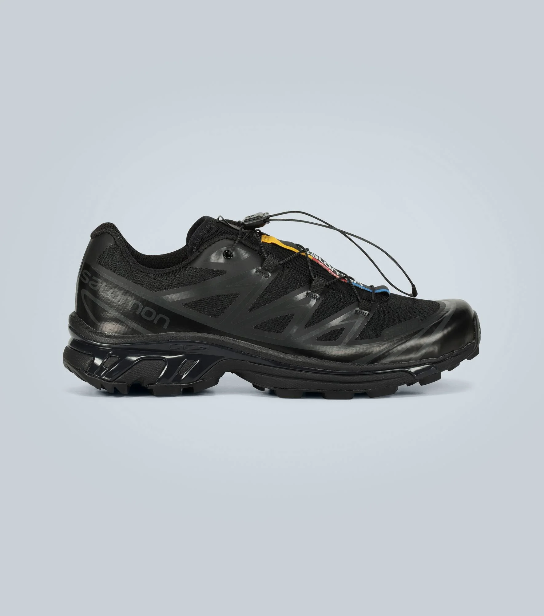 In a lightweight silhouette designed for high impact movement on tough terrains, these sleek Salomon sneakers feature a black fabric upper and colored tongue logo with minimal one-pull lacing resting on a cushioning yet durable rubber sole. Product Details - Upper: fabric - Sole: fabric insole, rubber sole - Toe shape: almond toe - Made in Vietnam - Designer color name: Black - Comes with a box - Closure: lace-up - Item number: P00463850 Size & Fit - True to size - UK sizes