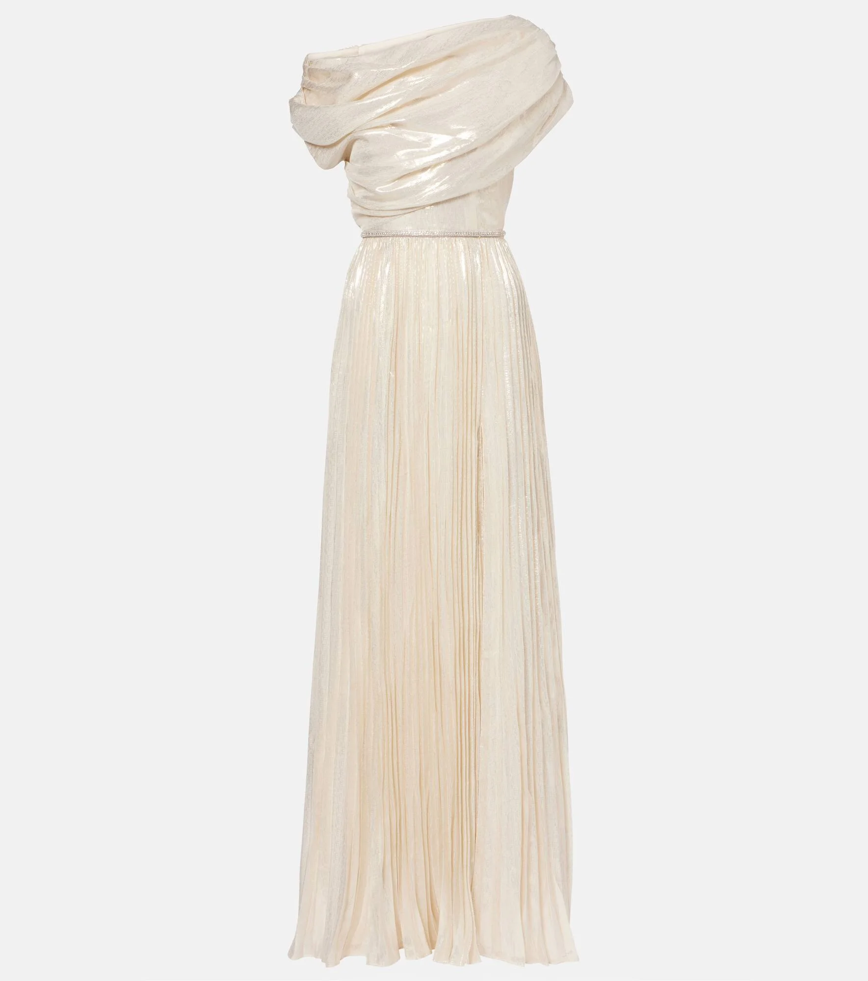Self-Portrait has built a strong cult following for its soft graceful aesthetic. Crafted from silk-blend chiffon, this maxi dress boasts a draped bodice with an asymmetric neckline, a plisse skirt with a front slit, and a detachable embellished belt. Product Details - Material: 67% silk, 33% metallic fibres - Care instructions: dry clean - Made in China - Color: gold - Designer color name: Champagne - Item color: gold - Lining: 100% polyester - Detachable belt - Closure: concealed zipped back - Item number: P01127423 Size & Fit - True to size - Cinched waist - Non-stretchy fabric - The model seen in the picture is 178cm-5'10" and wearing a size UK 8