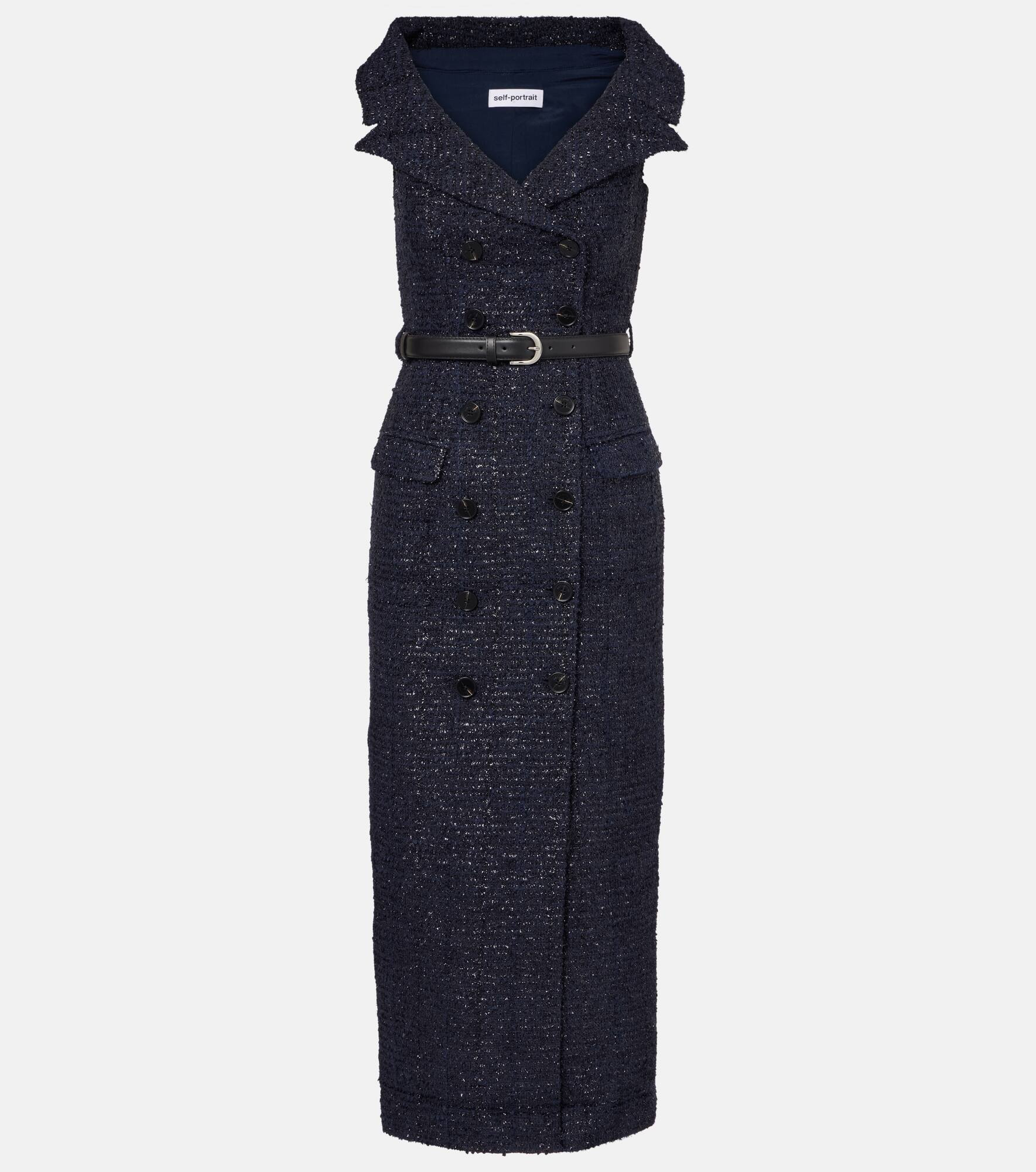Self-Portrait has built a strong cult following for its soft, graceful aesthetic. This midi dress is crafted from boucle with a shimmering finish and features a double-breasted front, a cinching belt, and a V-neckline. Product Details - Material: 66% polyester, 26% cotton, 8% metallic fibres - Care instructions: dry clean - Made in China - Designer color name: Navy - Item color: blue - Lining: 100% polyester - Details: 100% cow leather - Material II: 100% polyamide - Closure: double-breasted - Pockets: flap pockets - Peak lapel - Detachable belt - Item number: P01081552