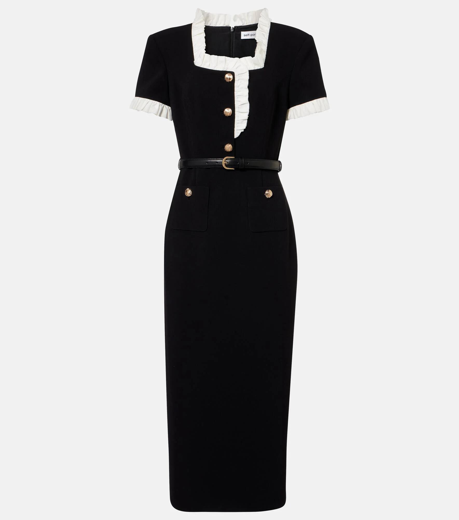 With a mission to celebrate women in every design, Self-Portrait has built a strong cult following for its soft, graceful aesthetic. Made from black crepe, this midi dress features contrasting ruffled trims, gold-toned buttons, and a belted waistline. Product Details - Material: 100% polyester - Care instructions: dry clean - Made in China - Color: black - Designer color name: Black - Closure: concealed zipped back - Short vent - Lining: 100% polyester - Pockets: buttoned pockets - Insert: 100% leather - Contains non-textile parts of animal origin - Detachable belt - Item number: P01146490 Size & Fit - True to size - Shoulder pad inserts - Cinched waist - Adjustable at the waist - Non-stretchy fabric - The model seen in the picture is 178cm-5'10" and wearing a size UK 8