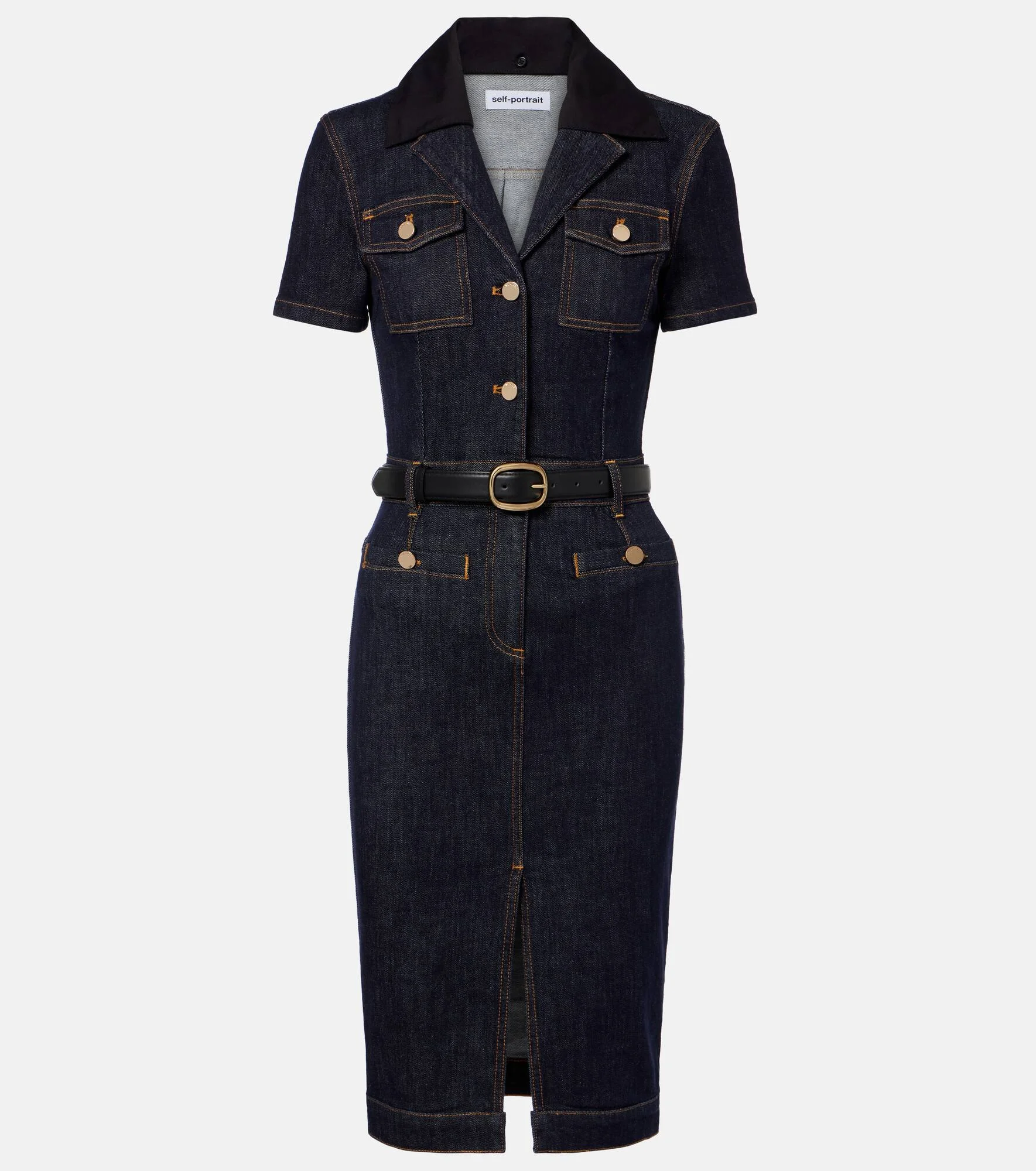 With a mission to celebrate women in every design, Self-Portrait has built a strong cult following for its soft graceful aesthetic. Made from cotton-blend denim, this figure-hugging midi dress comes with a removable belt. Product Details - Material: 94% cotton, 5% polyester, 1% elastane - Care instructions: dry clean - Made in China - Color: blue - Designer color name: Blue - Item color: blue - Trim: 100% cotton - Details: 100% leather - Contains non-textile parts of animal origin - Closure: buttoned front, concealed zipped front - Sleeves: short-sleeved - Collar: classic (Straight point) - Detachable belt - Pockets: snap-buttoned pockets, breast pockets - Long vent - Detachable collar - Material II: 84% polyester, 16% cotton - Item number: P01127473 Size & Fit - True to size - Cinched waist - Adjustable at the waist - Slightly stretchy fabric - The model seen in the picture is 178cm-5'10" and wearing a size UK 8