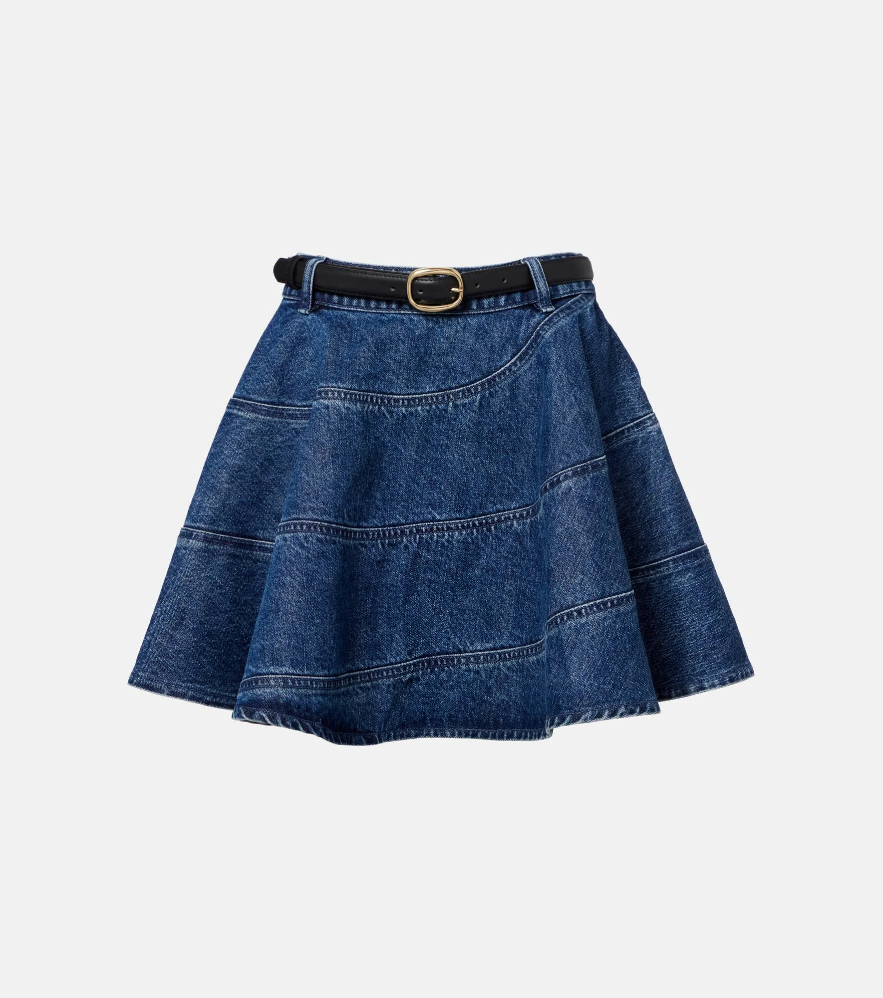With a mission to celebrate women in every design, Self-Portrait has built a strong cult following for its soft graceful aesthetic. This miniskirt is crafted from denim into a flared silhouette with a detachable belt and seam detailing. Product Details - Material: 100% cotton - Care instructions: dry clean - Made in China - Color: blue - Designer color name: Blue - Item color: blue - Hardware color: gold - Belt loops - Detachable belt - Closure: concealed zipped side - Item number: P01127419 Size & Fit - True to size - Non-stretchy fabric - The model seen in the picture is 178cm-5'10" and wearing a size UK 8