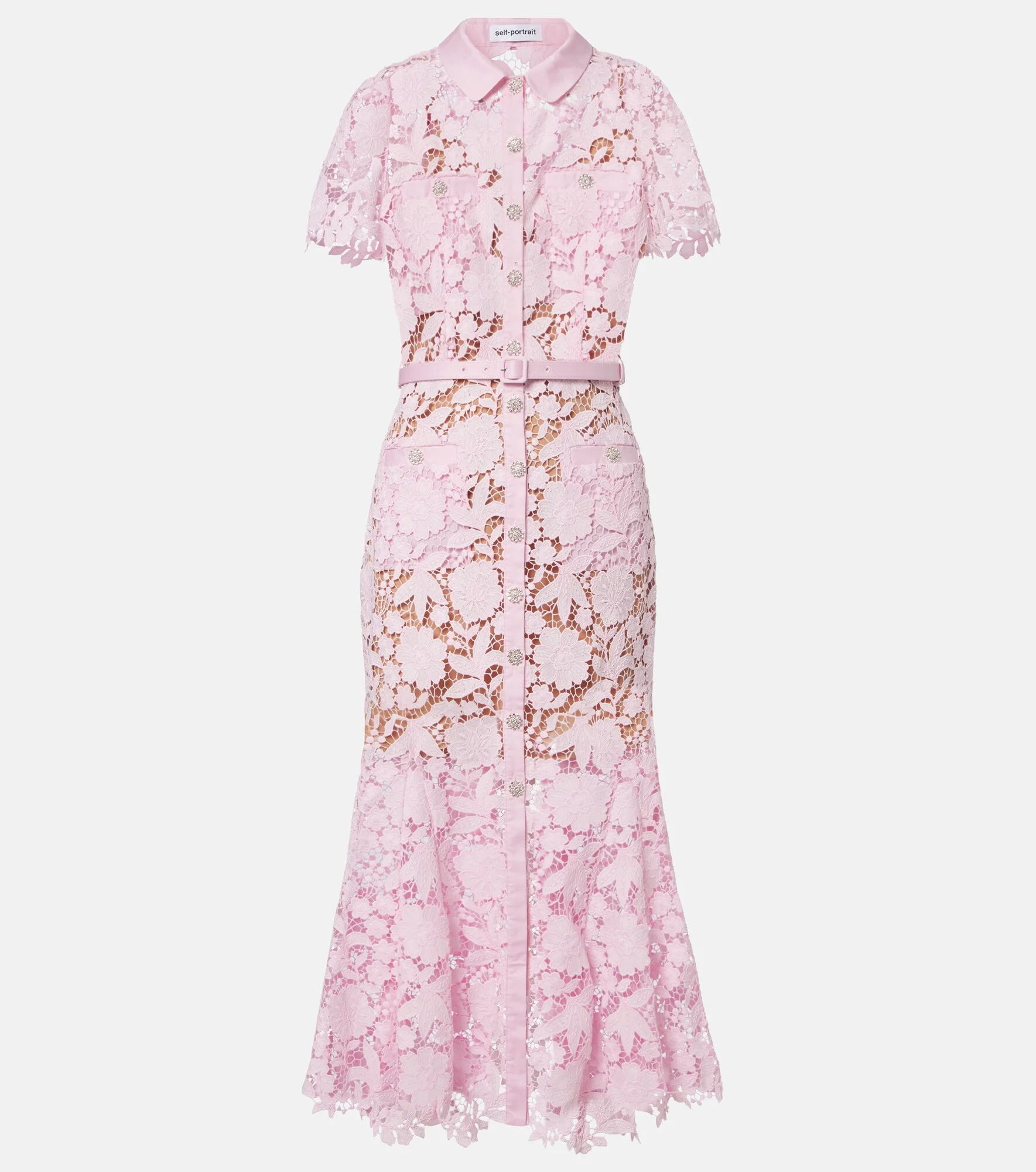 With a mission to celebrate women in every design, Self-Portrait has built a strong cult following for its soft, graceful aesthetic. Crafted from elegant pink lace, this shirt dress is cut to a midi silhouette with short sleeves, a classic collar, and a belted waist. Product Details - Material: 100% polyester - Care instructions: dry clean - Made in China - Color: pink - Designer color name: Pink - Material II: 100% polyester - Embroidery: 100% polyester - Trim: 100% cotton - Closure: buttoned front - Detachable belt - Detachable lining - Item number: P01146527 Size & Fit - True to size - Fitted - Non-stretchy fabric - The model seen in the picture is 178cm-5'10" and wearing a size %size%