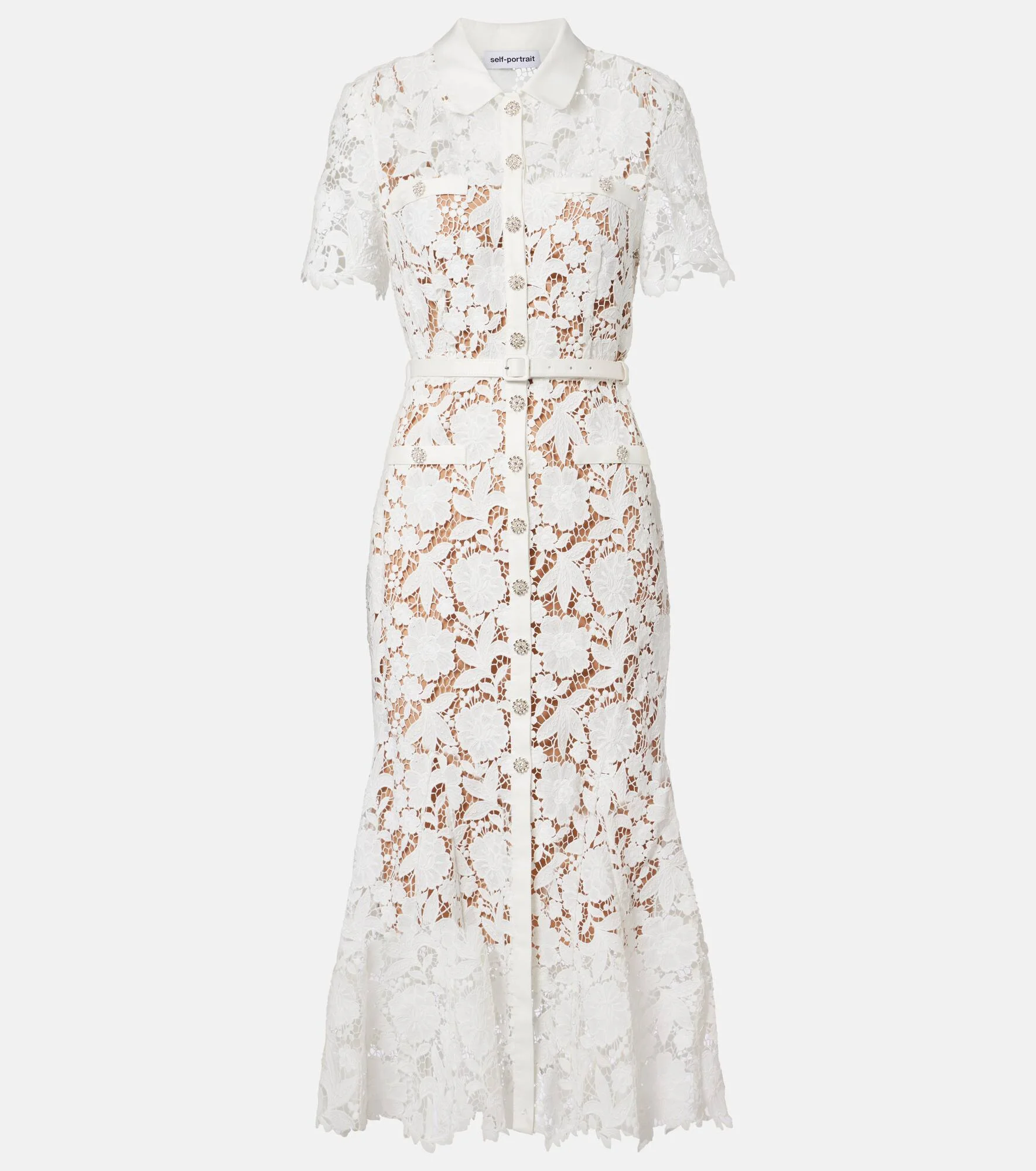 With a mission to celebrate women in every design, Self-Portrait has built a strong cult following for its soft, graceful aesthetic. Crafted from elegant white lace, this shirt dress is cut to a midi silhouette with short sleeves, a classic collar, and a belted waist. Product Details - Material: 100% polyester - Care instructions: dry clean - Made in China - Color: white - Designer color name: White - Lining: 100% polyester - Detachable belt - Closure: partially buttoned front - Item number: P01146496 Size & Fit - True to size - Cinched waist - Adjustable at the waist - Non-stretchy fabric - The model seen in the picture is 178cm-5'10" and wearing a size UK 8