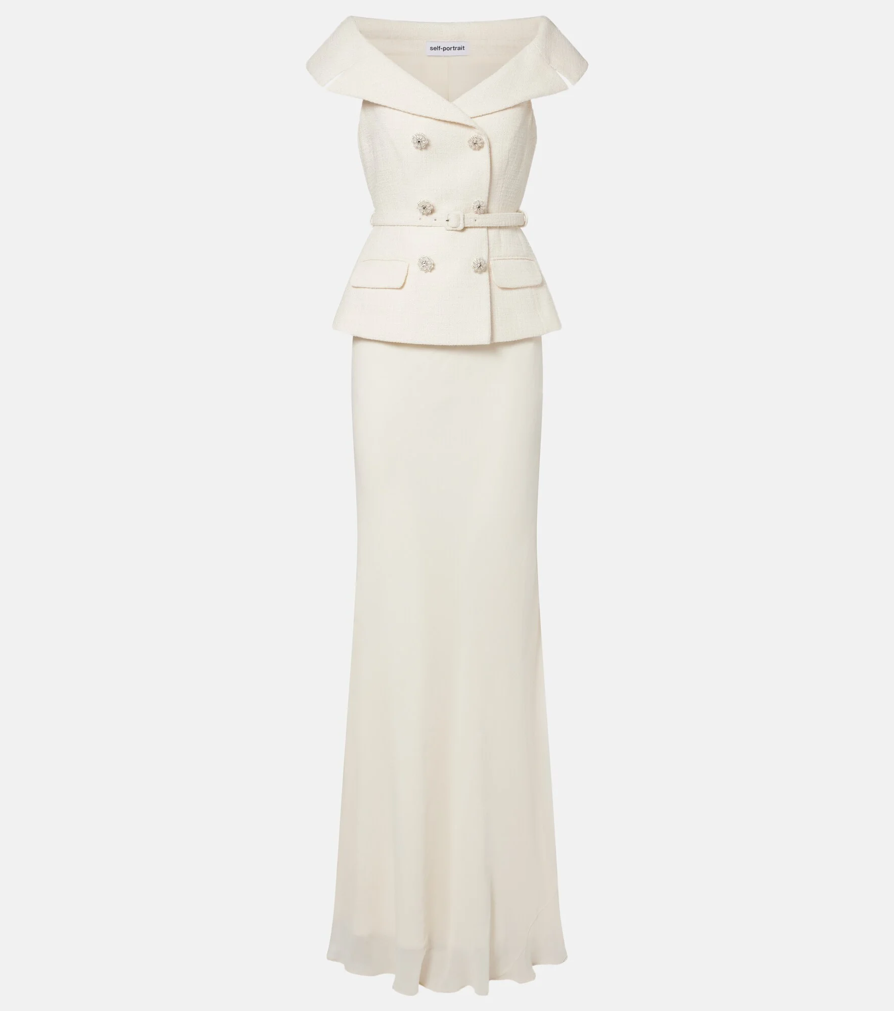With a mission to celebrate women in every design, Self-Portrait has built a strong cult following for its graceful aesthetic. Designed with a boucle bodice and draped georgette skirt, this gown features a belted waistline, peplum silhouette, and crystal-embellished buttons. Product Details - Material: 90% polyester, 9% viscose, 1% metallic fibres - Care instructions: dry clean - Made in China - Color: white - Designer color name: Cream - Lining: 100% polyester - Belt loops - Detachable belt - Item number: P01148375 Size & Fit - True to size - Cinched waist - Elasticated waist - Adjustable at the waist - Non-stretchy fabric - The model seen in the picture is 178cm-5'10" and wearing a size UK 8