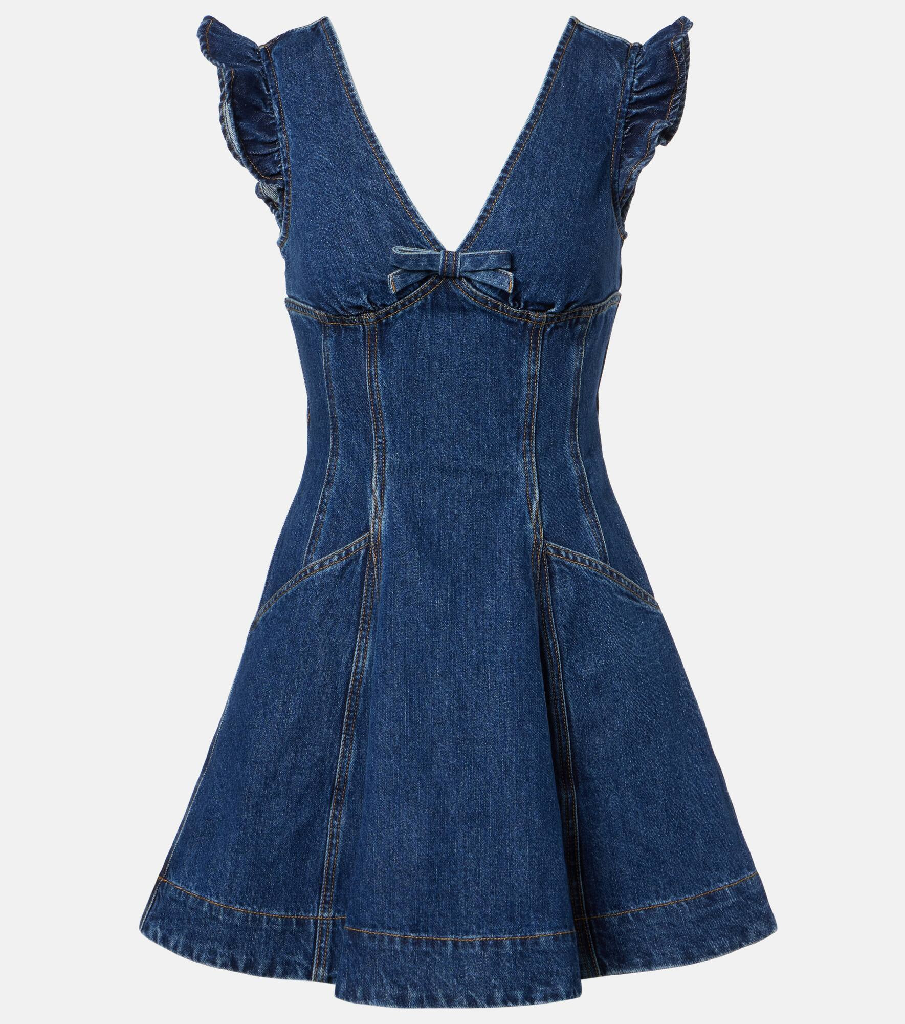 With a mission to celebrate women in every design, Self-Portrait has grown a strong cult following behind its soft, feminine aesthetic. Made from panels of cotton denim, this minidress features ruffle trims at the shoulders and bow detailing for a charming finish. Product Details - Material: 100% cotton - Care instructions: dry clean - Made in China - Designer color name: Mid Wash Blue - Item color: blue - Trim: 66% polyester, 34% cotton - Closure: zipped back - Collar: V-neck - Pockets: slant pockets - Item number: P01080242 Size & Fit - True to size - Low back - Cinched waist - Non-stretchy fabric - The model seen in the picture is 178cm-5'10" and wearing a size UK 8