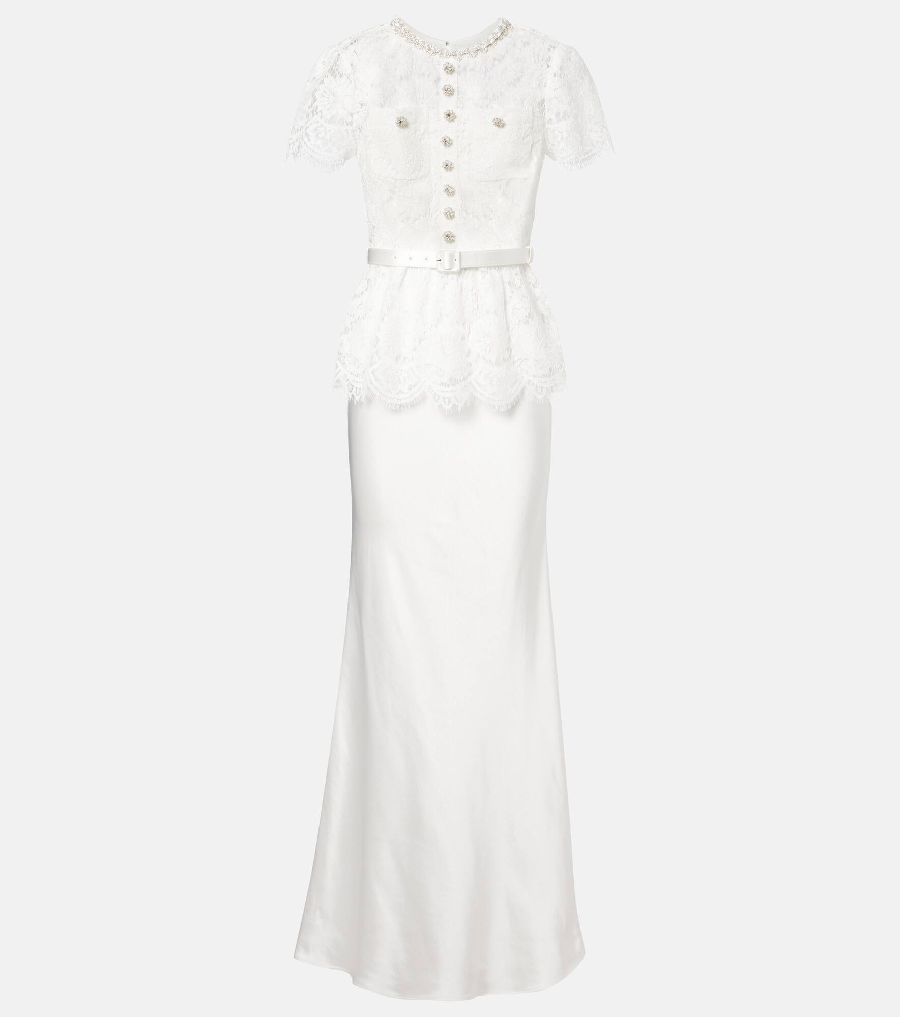With a mission to celebrate women in every design, Self-Portrait has grown a strong cult following behind its classically feminine aesthetic. This gown is crafted from satin with a lace overlay and is complete with charming embellishments. Product Details - Material: 100% polyester - Care instructions: dry clean - Made in China - Designer color name: White - Item color: white - Material II: 64% polyamide, 26% cotton, 10% viscose - Lining: 100% polyester - Closure: buttoned back, concealed zipper, zipped back, hook fastening - Pockets: rounded chest pockets - Hardware color: silver - Item number: P01080254 Size & Fit - True to size - Cinched waist - Non-stretchy fabric - The model seen in the picture is 178cm-5'10" and wearing a size UK 8