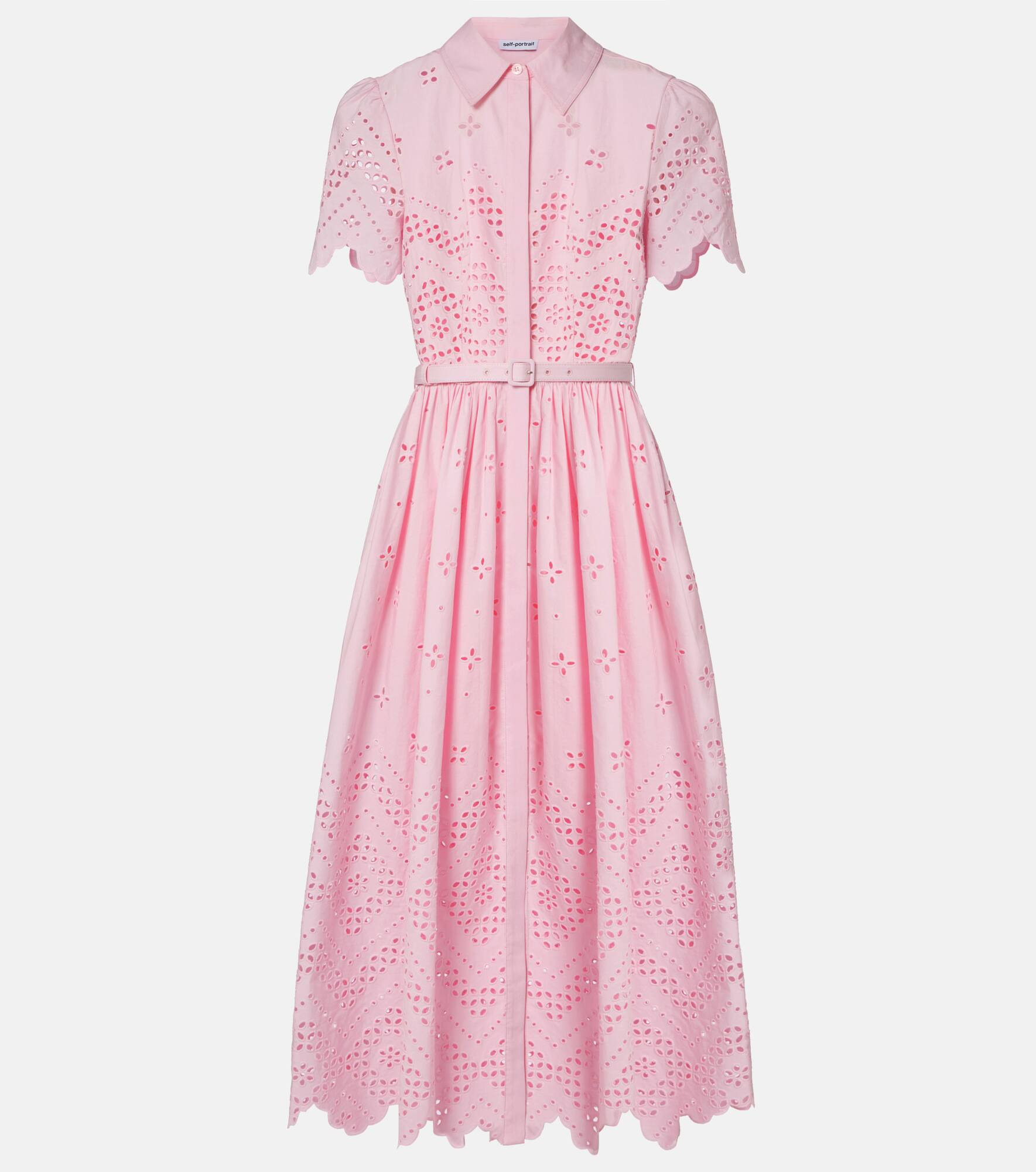 With a mission to celebrate women in every design, Self-Portrait has grown a strong cult following behind its soft, feminine aesthetic. This elegant cotton midi dress features charming broderie anglaise detailing, a pointed collar, and a tonal belt that accentuates the waist. Product Details - Material: 100% cotton - Care instructions: dry clean - Made in China - Designer color name: Pink - Item color: pink - Material II: 100% cotton - Collar: classic (Straight point) - Closure: buttoned front - Belt loops - Attached belt - Item number: P01075100 Size & Fit - True to size - Cinched waist - Non-stretchy fabric - The model seen in the picture is 178cm-5'10" and wearing a size UK 8