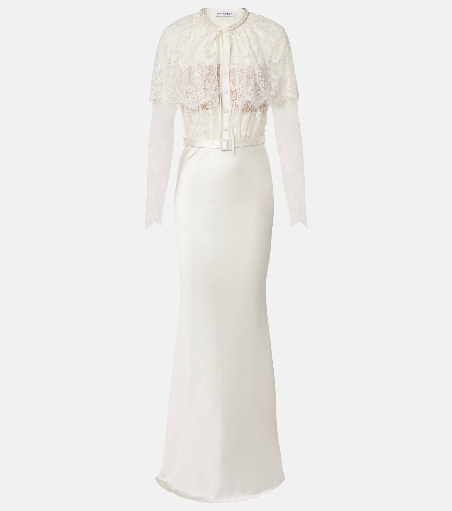 With a mission to celebrate women in every design, Self-Portrait has grown a strong cult following behind its soft, feminine aesthetic. This maxi dress features a caped lace top, a satin skirt, and a belt that accentuates the waist. Product Details - Material: 63% polyamide, 37% viscose - Care instructions: dry clean - Made in China - Designer color name: White - Item color: white - Material II: 100% polyester - Lining: 100% polyamide - Lining II: 100% polyester - Other inner trims: 100% polyester - Closure: partially buttoned front, concealed zipper, zipped side - Self-tie collar - Attached belt - Item number: P01074942 Size & Fit - True to size - Semi-sheer - Cinched waist - Non-stretchy fabric - The model seen in the picture is 178cm-5'10" and wearing a size UK 8