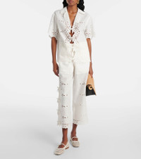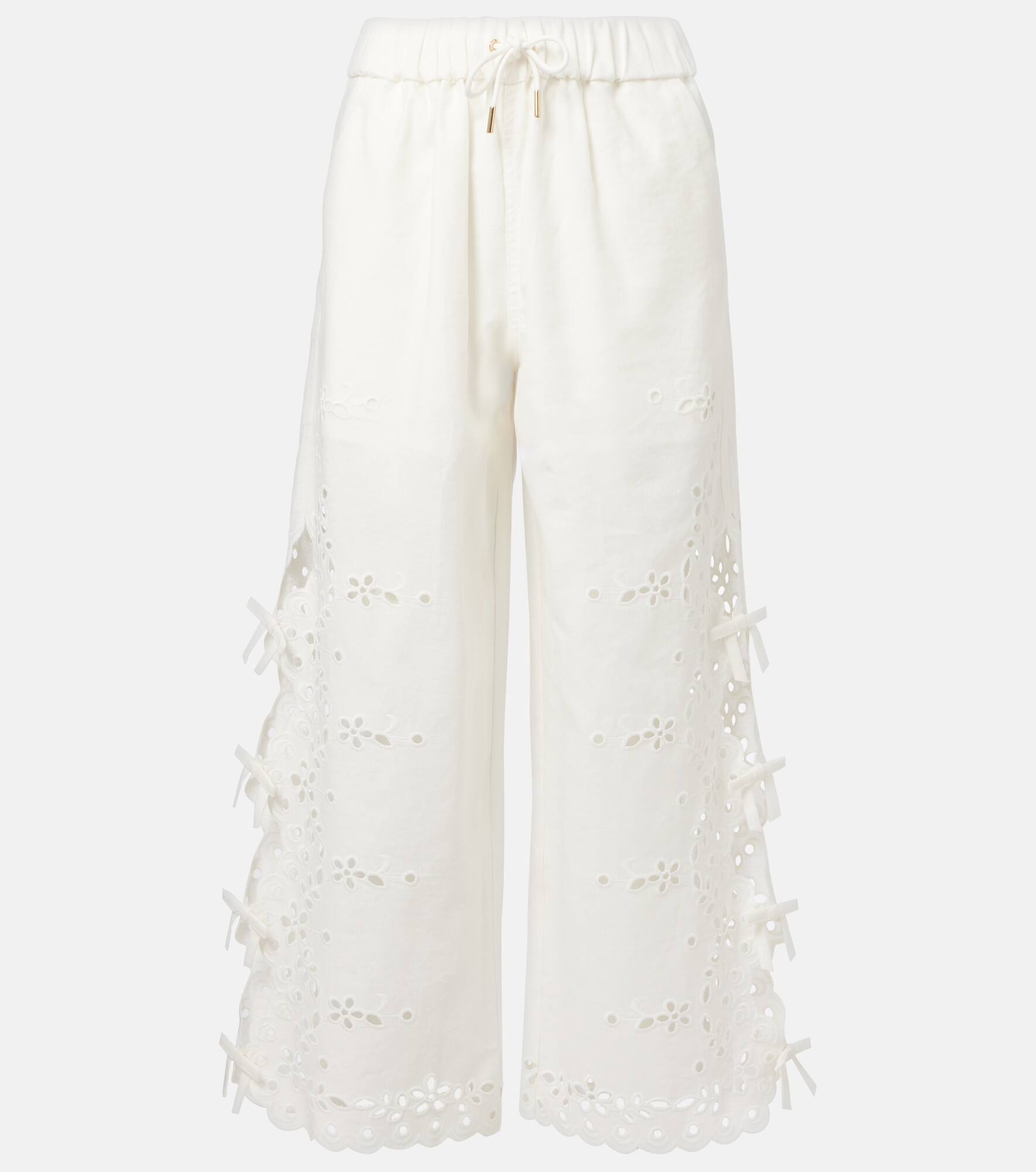 These lightweight pants from Self-Portrait are defined by their perforated, embroidered details and key-hole accents. The style is crafted from cotton and linen, and finished with scalloped edges. Pair yours with the matching top. Product Details - Material: 54% linen, 46% cotton - Care instructions: dry clean - Made in China - Designer color name: Cream - Item color: beige - Pockets: side slit pockets - Item number: P01047582 Size & Fit - True to size - Elasticated waist - Adjustable at the waist - Non-stretchy fabric - Wide-leg - The model seen in the picture is 178cm-5'10" and wearing a size UK 8