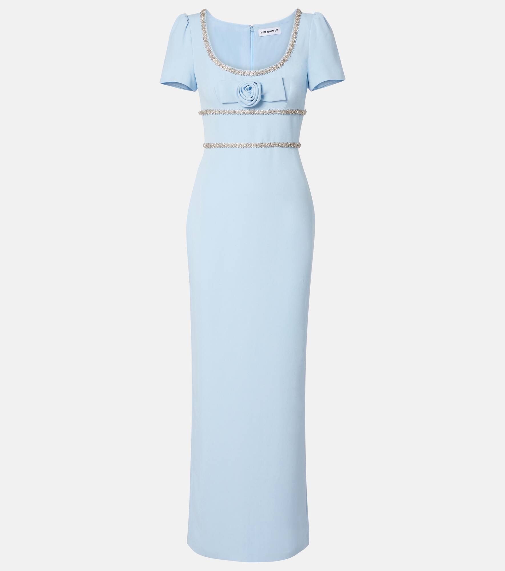 With a mission to celebrate women in every design, Self-Portrait has grown a strong cult following behind its soft, feminine aesthetic. This sophisticated crepe maxi dress is complete with dazzling diamante trims and a floral applique at the center. Product Details - Material: 100% polyester - Care instructions: dry clean - Made in China - Designer color name: Light Blue - Item color: blue - Hardware color: silver - Lining: 100% polyester - Trim: 100% crystals - Closure: concealed zipper, zipped back - Long vent - Item number: P01075095 Size & Fit - True to size - Cinched waist - Non-stretchy fabric - slit length 65cm-25.5" - The model seen in the picture is 178cm-5'10" and wearing a size UK 8