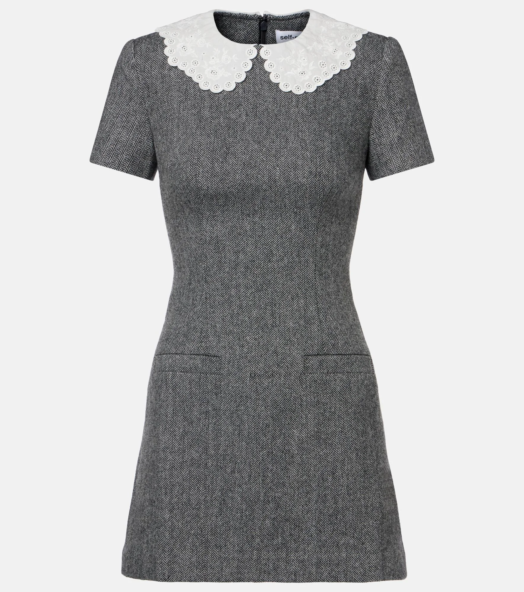 With a mission to celebrate women in every design, Self-Portrait has built a strong cult following for its soft graceful aesthetic. Made from wool blend, this herringbone minidress is finished with a broderie anglaise Peter Pan collar. Product Details - Material: 62% wool, 38% polyester - Care instructions: dry clean - Made in China - Color: grey - Designer color name: Grey - Item color: gray - Trim: 100% cotton - Embroidery: 100% polyester - Lining: 100% polyester - Pockets: welt pockets - Closure: concealed zipped back - Sleeves: short-sleeved - Item number: P01127364 Size & Fit - True to size - Shoulder pad inserts - Cinched waist - Non-stretchy fabric - The model seen in the picture is 178cm-5'10" and wearing a size UK 8