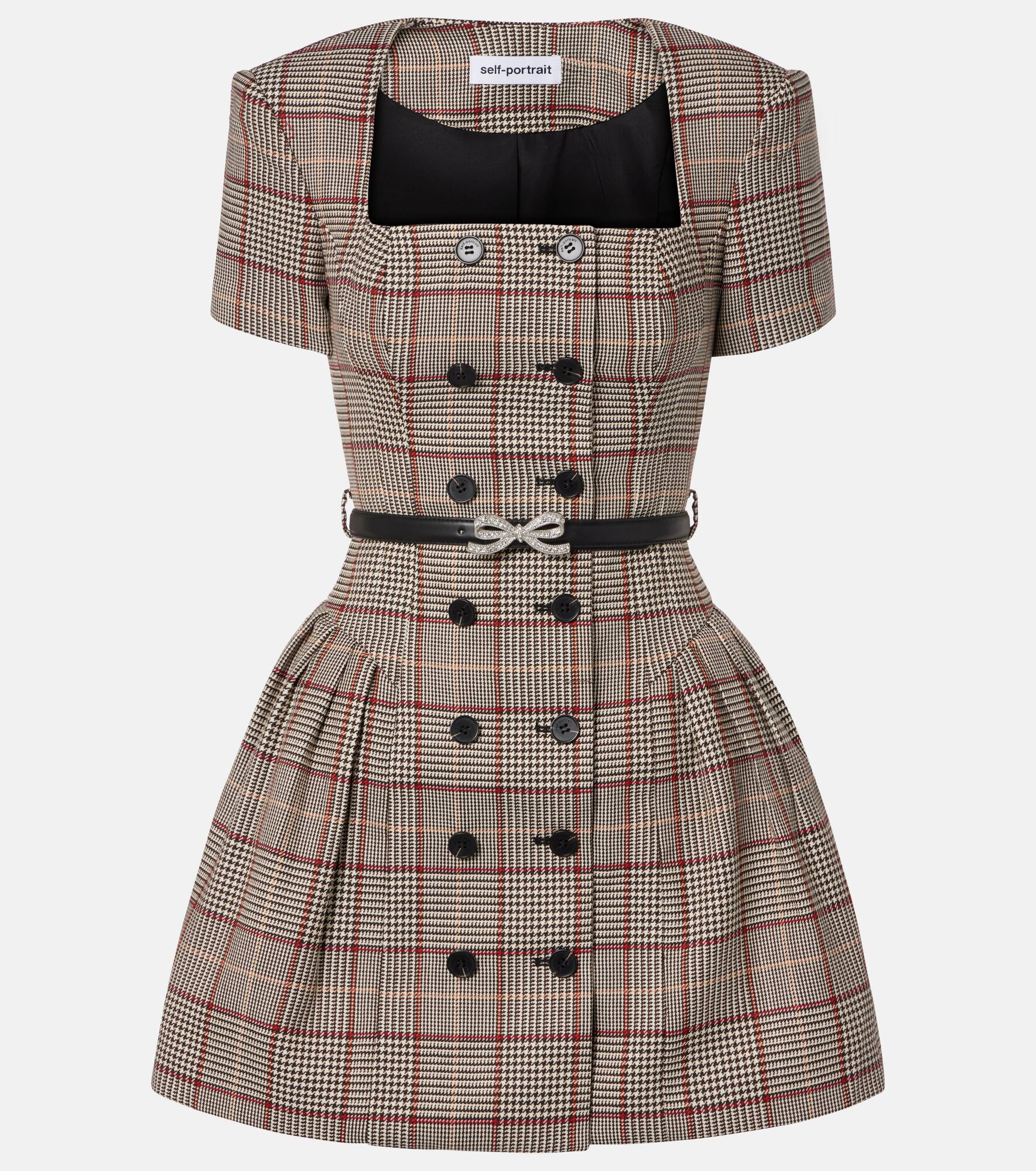 With a mission to celebrate women in every design, Self-Portrait has grown a strong cult following behind its soft, feminine aesthetic. Made from soft wool blend twill, this elegant minidress features a houndstooth pattern and a belt enriched with a diamante bow. Product Details - Material: 62% wool, 38% polyester - Care instructions: dry clean - Made in China - Designer color name: Brown - Item color: multicolor - Lining: 100% polyester - Lining II: 100% polyester - Trim: 100% cow leather - Detachable belt - Fully lined - Closure: buttoned front - Pockets: side slit pockets - Hem: straight - Belt loops - Item number: P01080029 Size & Fit - True to size - Shoulder pad inserts - Cinched waist - Non-stretchy fabric - The model seen in the picture is 178cm-5'10" and wearing a size UK 8