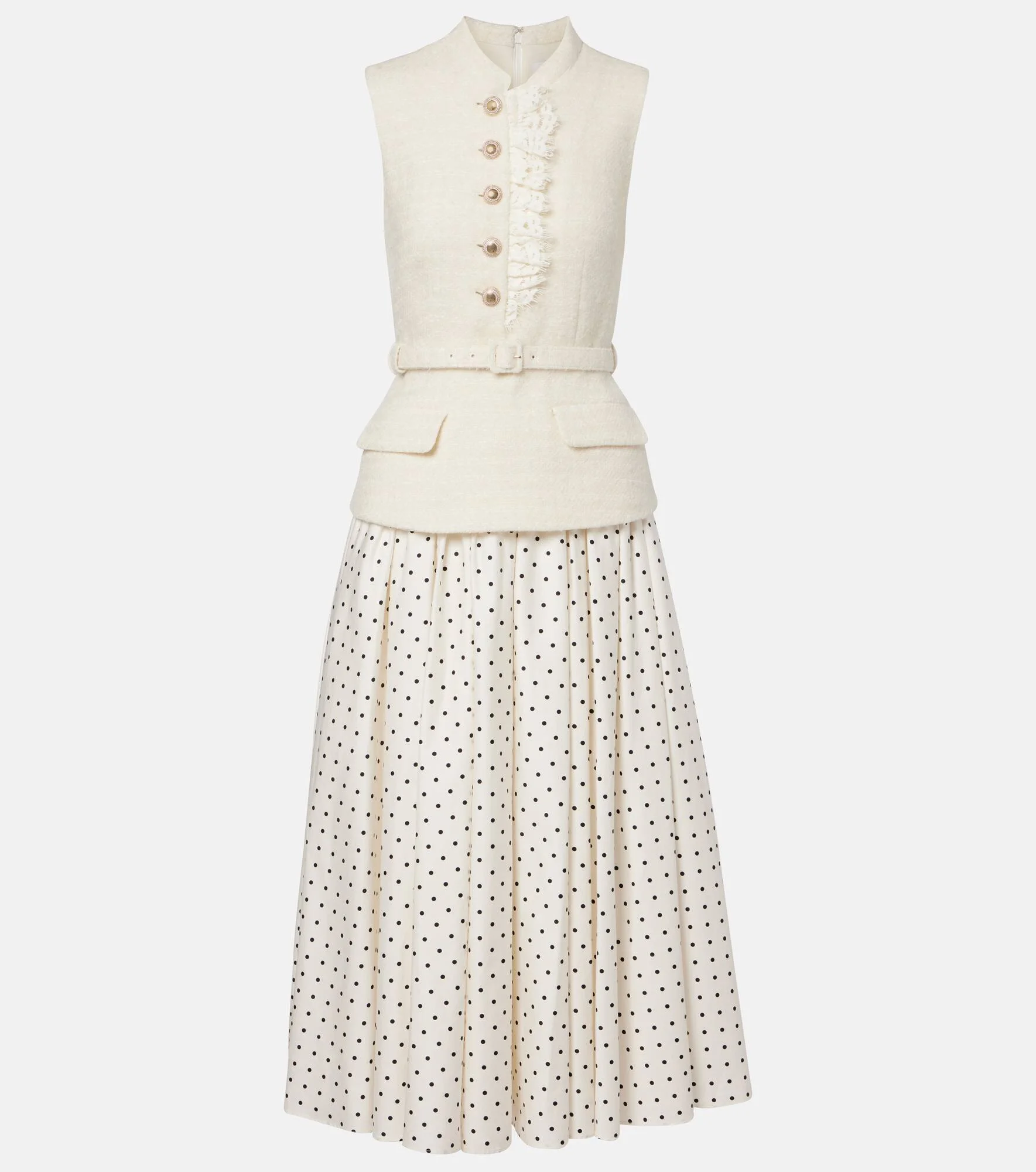 With a mission to celebrate women in every design, Self-Portrait has built a strong cult following for its soft graceful aesthetic. This chic midi dress combines a boucle belted bodice with a polka-dot skirt. Product Details - Material: 100% polyester - Care instructions: dry clean - Made in China - Color: white - Designer color name: Cream - Lining: 100% cotton - Lining II: 100% polyester - Closure: concealed zipped back - Detachable belt - Item number: P01146488 Size & Fit - True to size - Cinched waist - Adjustable at the waist - Non-stretchy fabric - The model seen in the picture is 178cm-5'10" and wearing a size UK 8