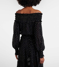With a mission to celebrate women in every design, Self-Portrait has built a strong cult following for its graceful aesthetic. Complete with gold-toned metallic-effect polka dots, this top is an off-shoulder piece with a shirred neck and hemline. Product Details - Material: 99% viscose, 1% metallic fibres - Care instructions: dry clean - Made in China - Color: black - Designer color name: Black - Item color: black, silver - Cuff: elasticated - Elasticated waistband - Item number: P01127455 Size & Fit - True to size - Off-the-shoulder - Loose fit, elasticated waist - Non-stretchy fabric - Slightly cropped - The model seen in the picture is 178cm-5'10" and wearing a size UK 8