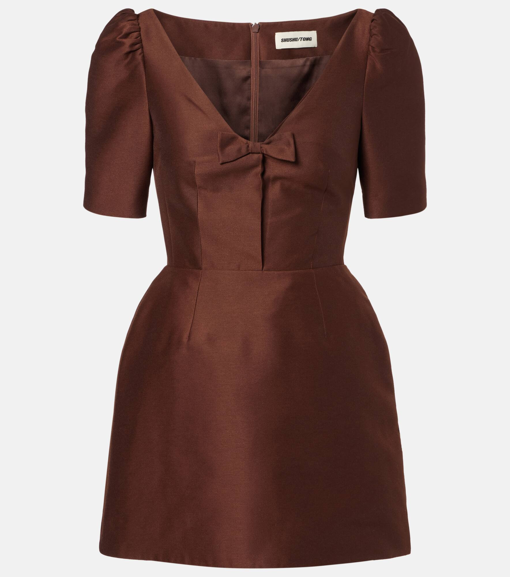 Shushu/Tong's designs marry traditionally feminine codes with a fashion-forward sensibility. This minidress is made from a lustrous fabric with a deep neckline and delicate bow detailing on the front. Product Details - Material: 100% polyester - Care instructions: dry clean - Made in Japan - Designer color name: Brown - Item color: brown - Lining: 96.4% polyester, 3.6% elastane - Material II: 100% silk - Interlining: 100% polyester - Closure: invisible zipper - Item number: P01093430 Size & Fit - True to size - Cinched waist - Non-stretchy fabric - The model seen in the picture is 178cm-5'10" and wearing a size UK 8