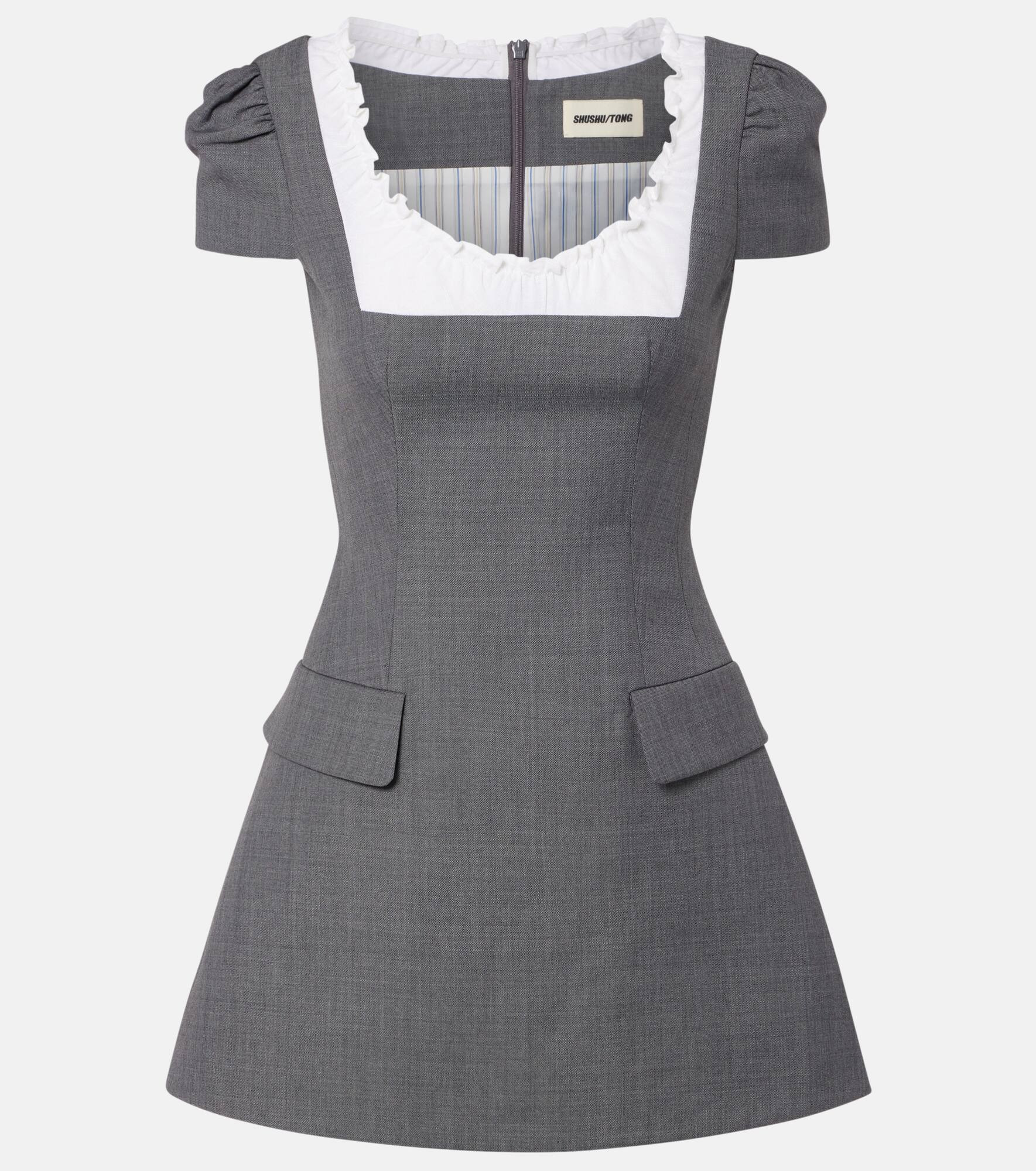 With sculptural silhouettes and elegant charm, Shushu/Tong delivers fashion-forward polish. This minidress features a fitted silhouette with a cinched waist, complemented by a ruffled neckline and faux pockets. Product Details - Material: 51% polyester, 49% wool - Care instructions: dry clean - Made in Japan - Designer color name: Grey - Item color: gray - Insert: 50% wool, 50% linen - Lining: 100% polyester - Interlining: 100% polyester - Pockets: flap pockets - Closure: invisible zipper - Item number: P01093437 Size & Fit - True to size - Cinched waist - Non-stretchy fabric - The model seen in the picture is 178cm-5'10" and wearing a size UK 8