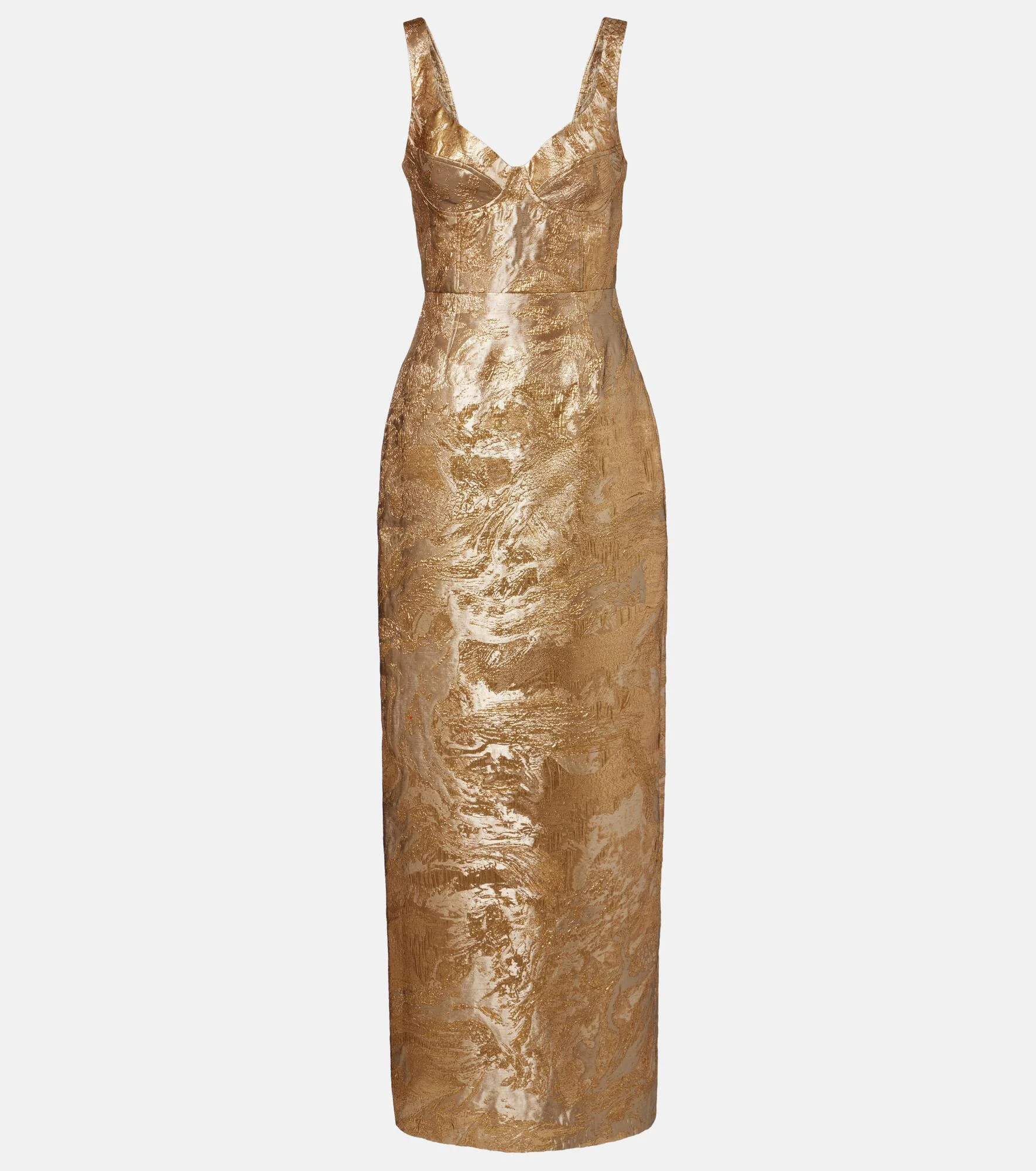 Inspired by sculpture and architecture, Simkhai's designs combine innovative construction with hand-detailing. This gold-hued cocktail dress is shaped to a midi-length, column silhouette with a bustier bodice and elegant all-over metallic jacquard pattern. Product Details - Material: 100% polyester - Care instructions: dry clean - Made in Turkey - Color: gold - Designer color name: Gold - Item color: gold - Lining: 51% polyester, 49% elastane - Closure: invisible zipper - Item number: P01125131 Size & Fit - Fits large to size - we recommend trying one size smaller - Low back - Cinched waist - Non-stretchy fabric - slit length 56,0cm-22" - The model seen in the picture is 178cm-5'10" and wearing a size US 2