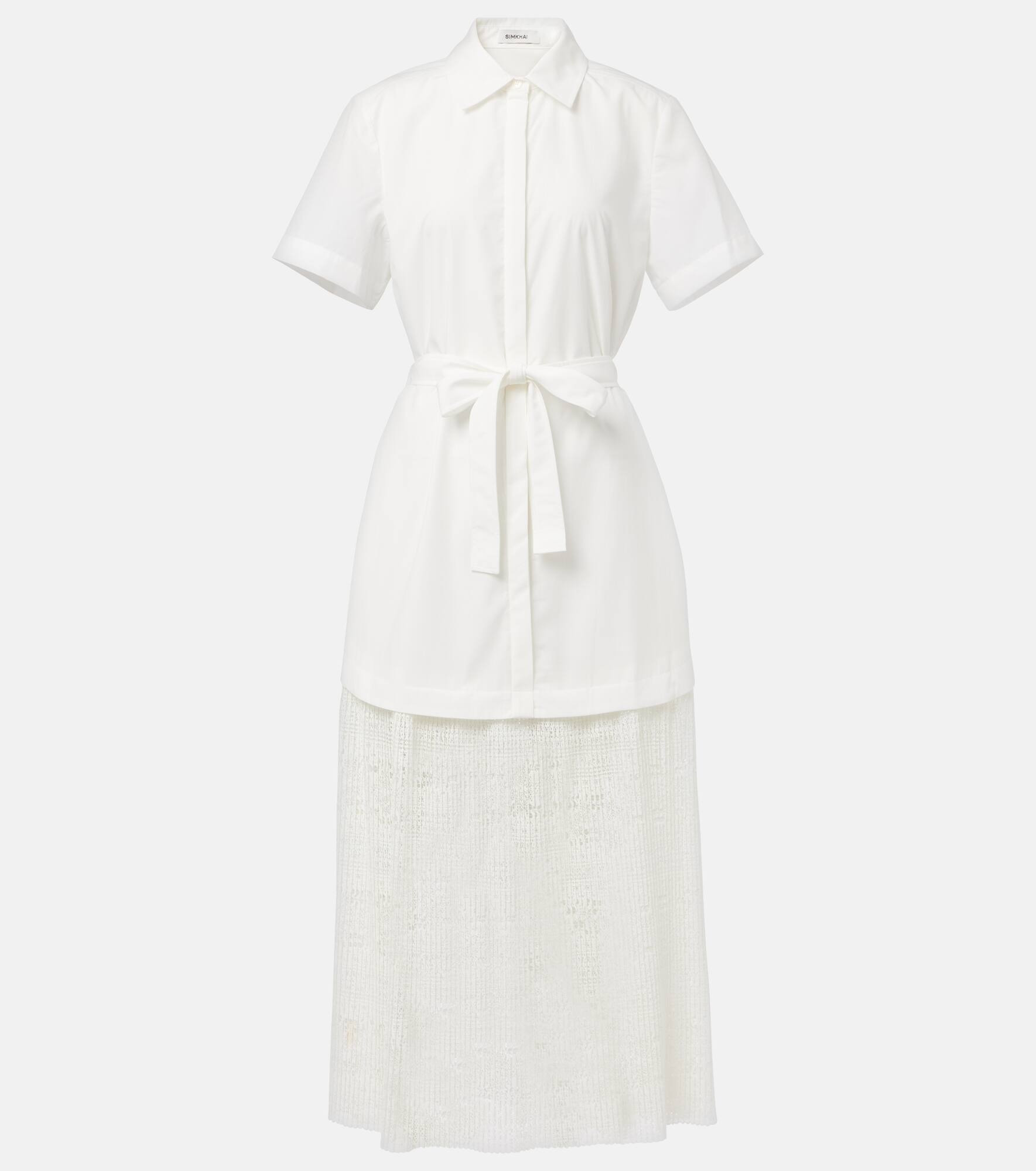 Cut to midi length, the Jenner shirt dress from Simkhai features an elegant silhouette with an intricate semi-sheer lace skirt and poplin upper. The short sleeve design is complete with buttoned front closure and a flattering belted waist. Product Details - Material: 100% polyester - Care instructions: hand wash - Made in China - Designer color name: White - Item color: white - Fully lined - Lining: 100% cotton - Item number: P01056536 Size & Fit - True to size - Dropped shoulders - Loose fit, comes with belt - Non-stretchy fabric - The model seen in the picture is 178cm-5'10" and wearing a size US 4