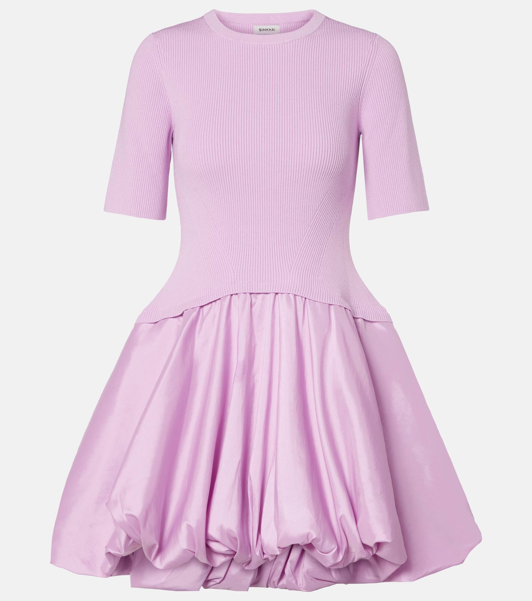 Count on Simkhai for unique silhouettes destined to make a lasting impression. The Kenny minidress features a ribbed-knit bodice with a billowy taffeta skirt for maximum impact. Product Details - Material: 83% viscose, 17% elastane - Care instructions: dry clean - Made in China - Designer color name: Orchid - Item color: purple - Trim: 70% polyester, 30% nylon - Lining: 100% nylon - Collar: crewneck - Half-lined - Sleeves: short-sleeved - Item number: P01068659 Size & Fit - True to size - Relaxed fit from the hip down - Partly stretchy fabric - The model seen in the picture is 178cm-5'10" and wearing a size XS