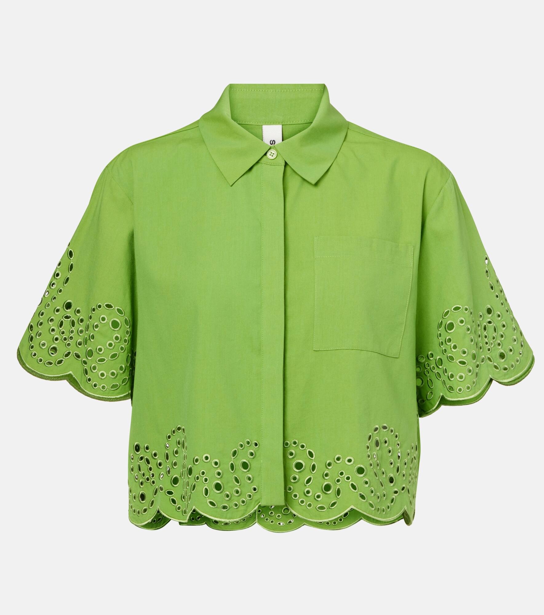 Taking inspiration from sculpture and architecture, Simkhai's impactful designs combine innovative construction with hand-detailing. Crafted from a cotton blend, the Keyla top features intricate broderie anglaise detailing and a slightly cropped length. Product Details - Material: 51% cotton, 49% rayon - Care instructions: dry clean - Made in China - Designer color name: Deep Peridot - Item color: green - Closure: buttoned front - Pockets: breast pocket - Item number: P01053092 Size & Fit - True to size - Designed for a loose fit - Non-stretchy fabric - Cropped - The model seen in the picture is 178cm-5'10" and wearing a size XS