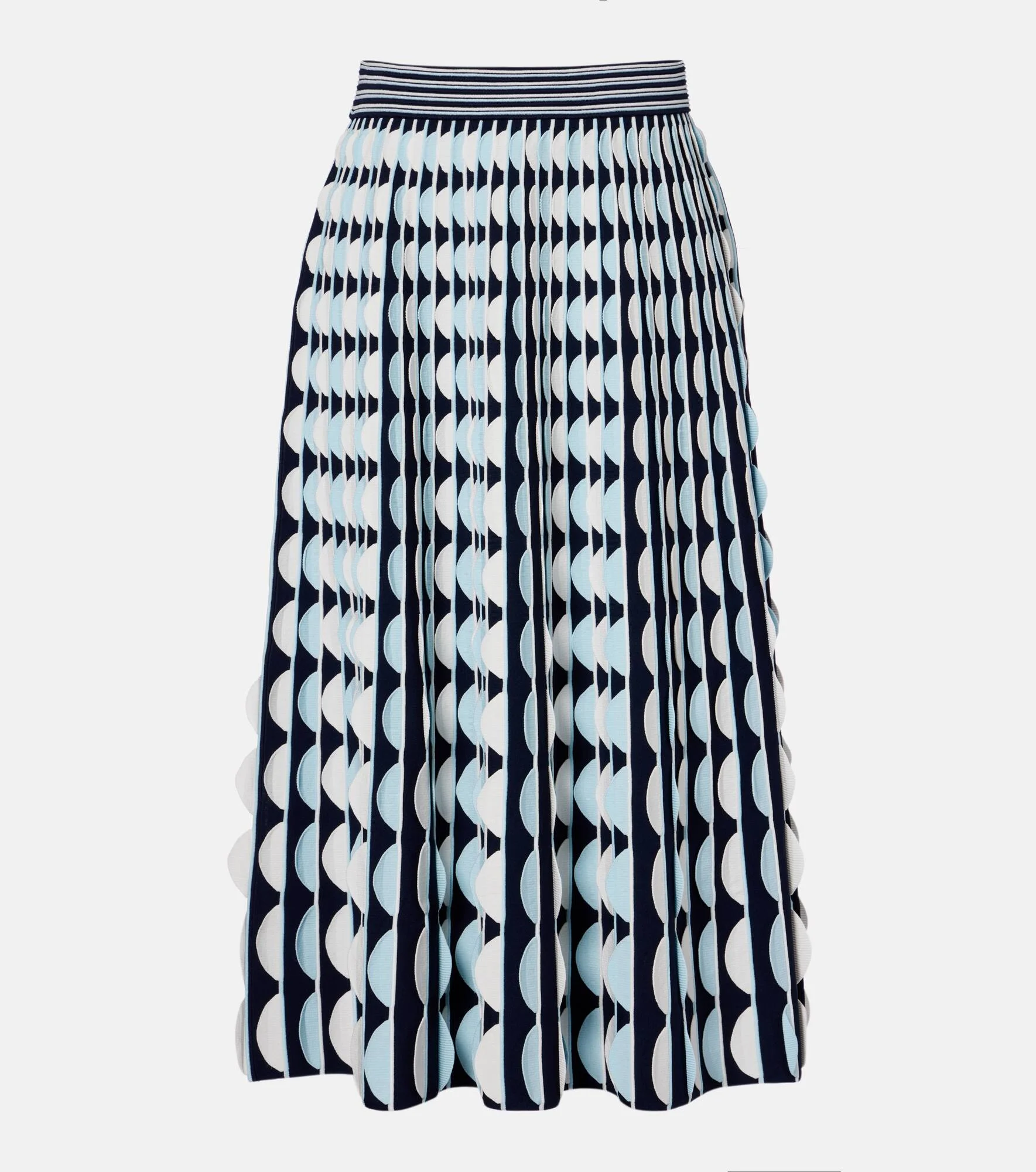 Crafted in a compact knit, the Micah skirt from Simkhai features a rhythmic scalloped pattern throughout. An everyday essential with a graphic edge, the midi silhouette is structured and comfortable at once. Product Details - Material: 76% rayon, 16% polyester, 7% nylon, 1% elastane - Care instructions: dry clean - Made in China - Color: blue - Designer color name: Sky Multi - Item color: blue - Elasticated waistband - Item number: P01125135 Size & Fit - True to size - Elasticated waist - Stretchy fabric - The model seen in the picture is 178cm-5'10" and wearing a size XS