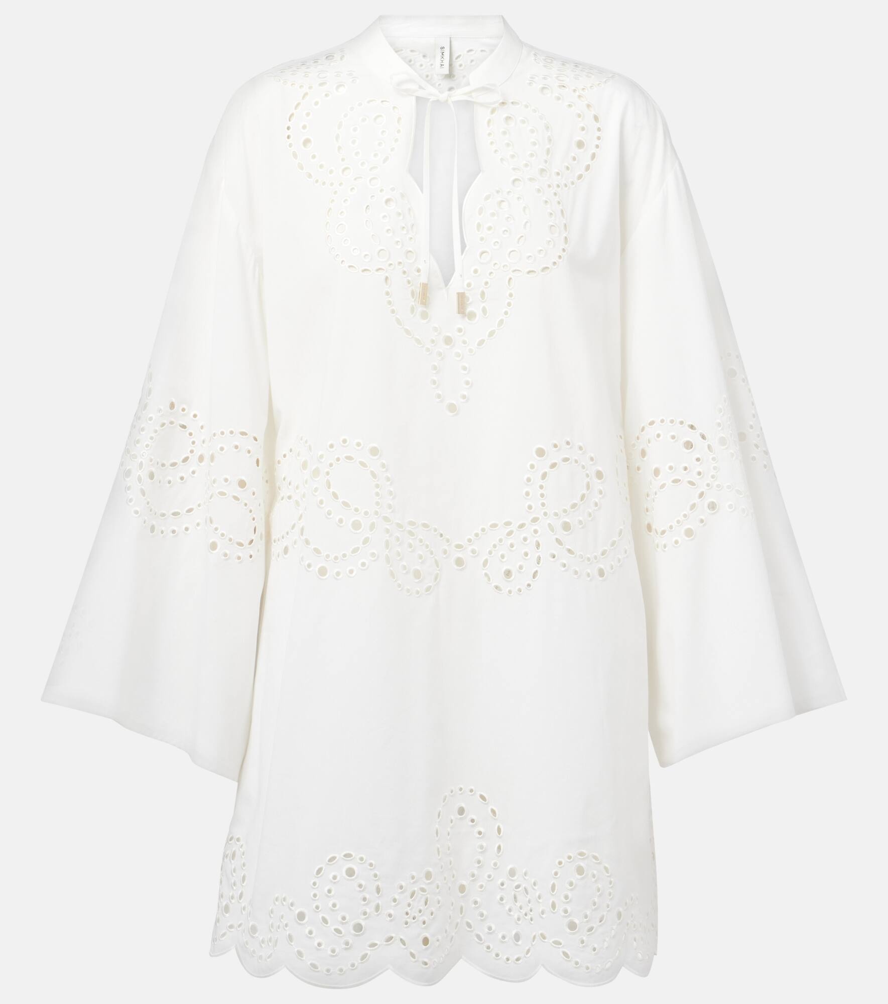 Taking inspiration from sculpture and architecture, Simkhai's impactful designs combine innovative construction with hand-detailing. Crafted from a cotton blend, the Sarina minidress is lightweight and features broderie anglaise detailing and a V-neckline. Product Details - Material: 51% cotton, 49% rayon - Care instructions: dry clean - Made in China - Designer color name: White - Item color: white - Item number: P01053090 Size & Fit - True to size - Dropped shoulders - Designed for a loose fit - Non-stretchy fabric - The model seen in the picture is 178cm-5'10" and wearing a size XS