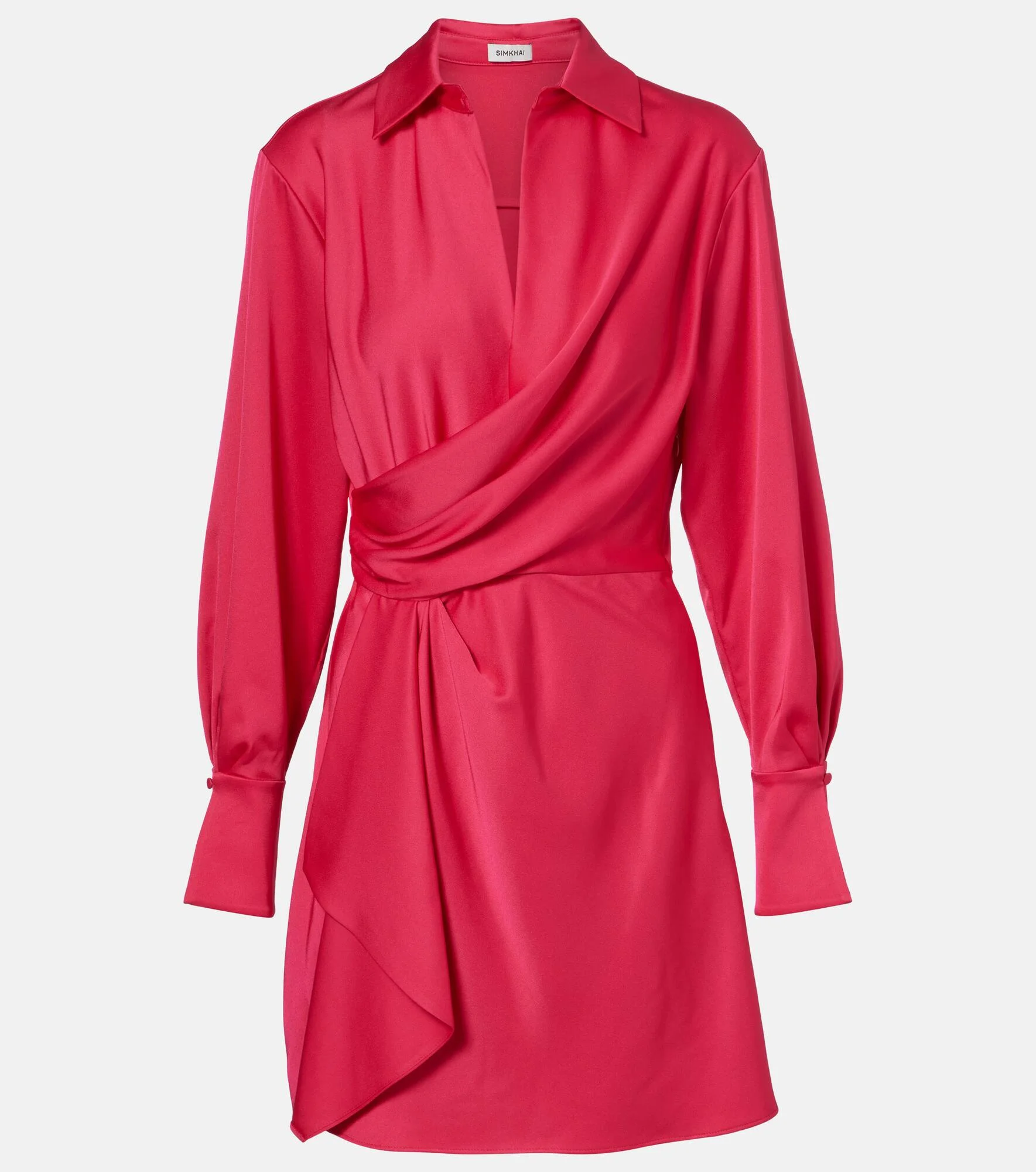Inspired by sculpture and architecture, Simkhai's designs combine innovative construction with hand-detailing. The Talit dress is crafted from satin and designed with a wrap silhouette that boasts elegant draping. Product Details - Material: 84% acetate, 16% polyester - Care instructions: dry clean - Made in China - Designer color name: Fuchsia - Item color: pink - Lining: 100% polyester - Collar: classic (Straight point) - Closure: hook-fastening front, concealed zipped back - Cuff: buttoned - Item number: P01113725 Size & Fit - True to size - Dropped shoulders - Cinched waist - Non-stretchy fabric - The model seen in the picture is 178cm-5'10" and wearing a size US 4