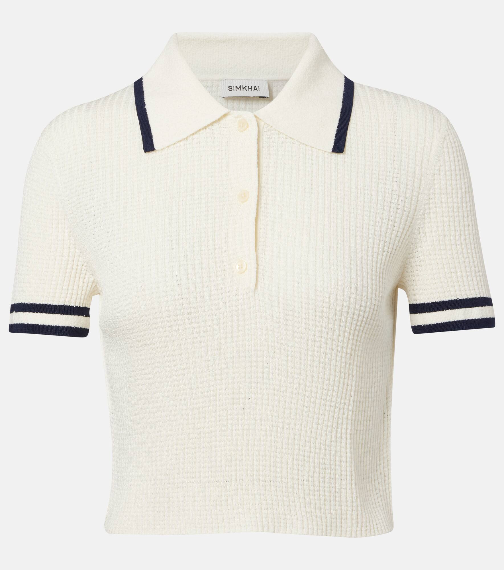 Center your everyday looks around pieces like the Whitten polo shirt from Simkhai. Offering a refined take on textural design, this micro boucle style comes in a slightly cropped silhouette and is complete with stripe patterns at the collar and cuffs. Product Details - Material: 44% rayon, 28% cotton, 27% nylon, 1% elastane - Care instructions: dry clean - Made in China - Designer color name: Ivory Multi - Item color: ivory, blue - Closure: buttoned placket - Collar: polo collar - Item number: P01065962 Size & Fit - True to size - Straight fit - Non-stretchy fabric - Cropped - The model seen in the picture is 178cm-5'10" and wearing a size XS