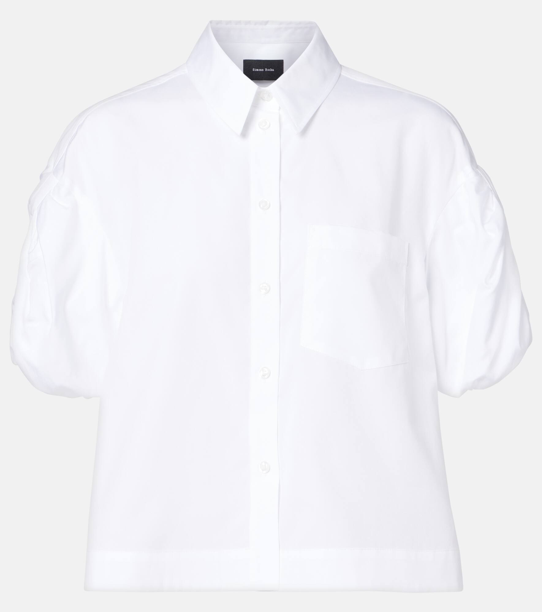 This Simone Rocha cropped shirt is crafted from crisp cotton poplin and features signature puffed sleeves with gathered bow details. Designed with a classic pointed collar, buttoned front, and chest pocket, this piece offers timeless charm. Product Details - Material: 100% cotton - Care instructions: machine wash at 40 degrees - Made in Portugal - Designer color name: White - Item color: white - Collar: classic (Straight point) - Pockets: angled chest pocket - Closure: buttoned front - Item number: P01074246 Size & Fit - True to size - Dropped shoulders - Designed for a loose fit - Non-stretchy fabric - Falls to the hip - The model seen in the picture is 178cm-5'10" and wearing a size UK 8