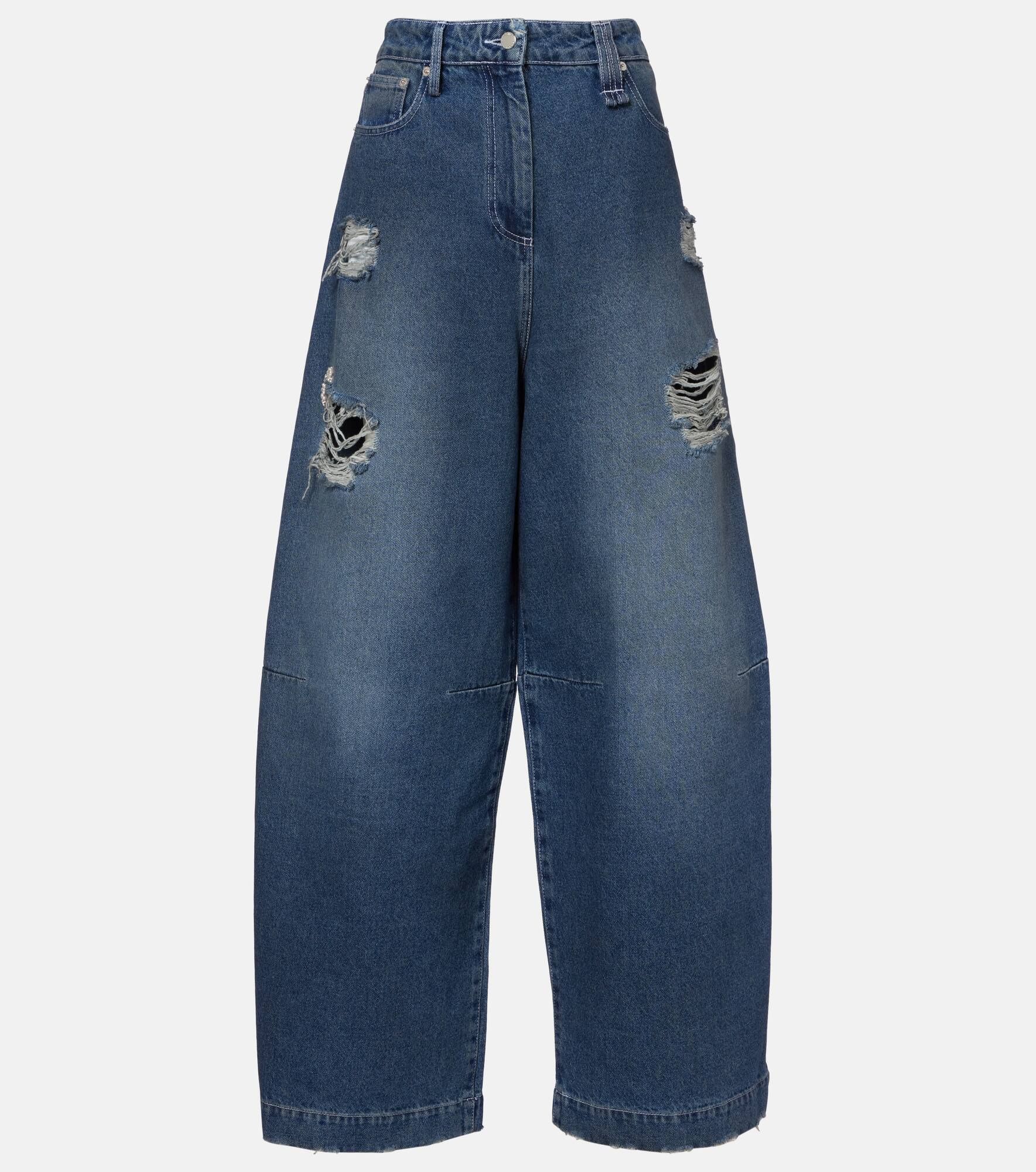 A mainstay at London Fashion Week, Simone Rocha's artful aesthetic is a subversive take on romance and elegance. These ultra wide-leg jeans sit high on the waist and featuring distressed detailing, finished with a playful faux-pearl and chain embellishment. Product Details - Material: 100% cotton - Care instructions: hand wash - Made in Portugal - Designer color name: Distressed/Blue/Pearl/Clear - Item color: blue - Closure: zipper fly, button fastening - Pockets: five pockets - Belt loops - Distressed details - Item number: P01074239 Size & Fit - Fits large to size - we recommend trying one size smaller - Non-stretchy fabric - Wide-leg - Mid-rise - The model seen in the picture is 178cm-5'10" and wearing a size UK 6
