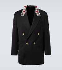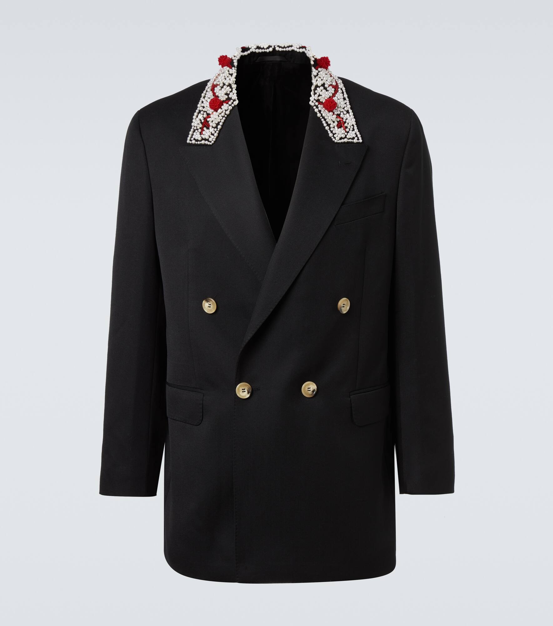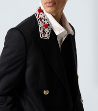 Your tailoring collection deserves pieces like this blazer from Simone Rocha. The double-breasted style is enriched with intricate faux pearl and bead embellishments at the collar. Product Details - Material: 55% polyester, 45% wool - Care instructions: dry clean - Made in Portugal - Designer color name: Black/Pearl/Red - Item color: black - Lining: 100% polyester - Closure: double-breasted (four buttons) - Pockets: flap pockets, internal pockets - Cuff: four buttons - Vent: double - Item number: P01064451 Size & Fit - True to size - Straight fit - Non-stretchy fabric - Falls below the hip - Height of model is 188cm-74" and wears a size L