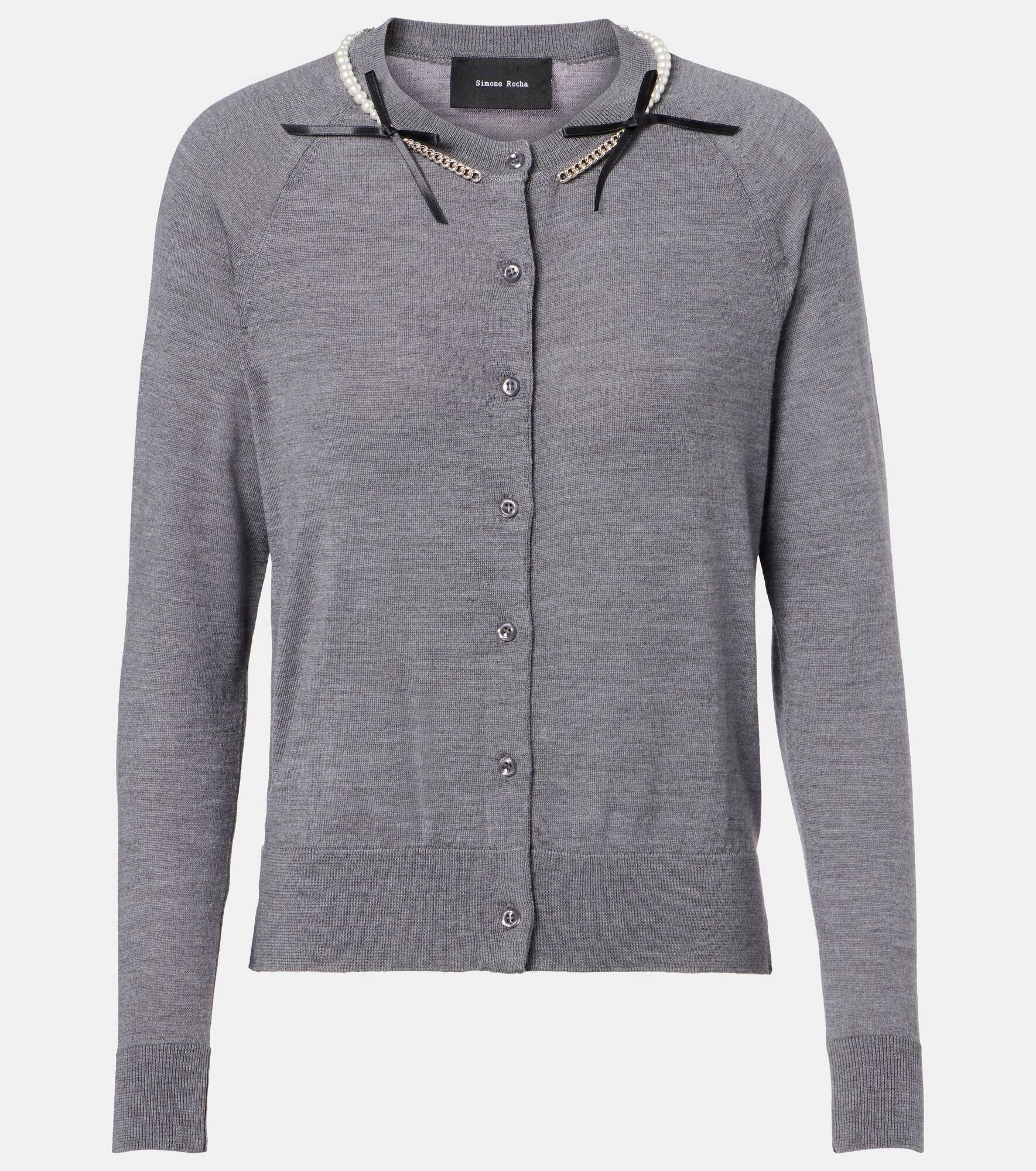 Simone Rocha’s signature glass pearl embellishments are a symbol of the brand’s romantic elegance. This cardigan is crafted from a blend of wool and silk and features dainty bows along the collar. Product Details - Material: 75% wool (merino wool), 25% silk - Care instructions: hand wash - Made in Portugal - Designer color name: Charcoal/Pearl - Item color: gray - Closure: buttoned front - Collar: crewneck - Cuff: ribbed - Hem: ribbed - Item number: P01074262 Size & Fit - True to size - Straight fit - Stretchy fabric - Slightly cropped - The model seen in the picture is 178cm-5'10" and wearing a size XS